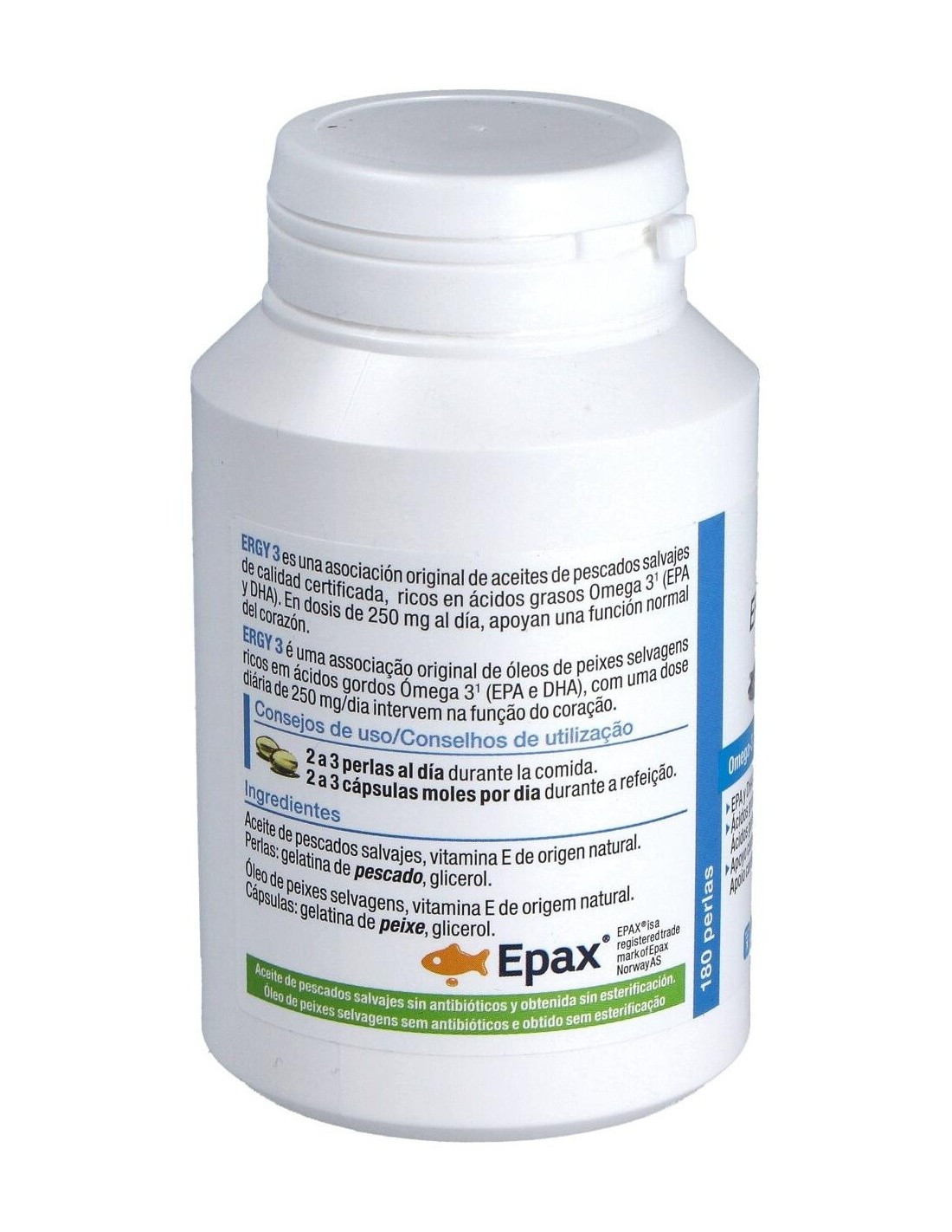 Complemento alimenticio compuesto de aceites de pescados EPAX de calidad certificada. Los pescados grasos como la anchoa, utilizado en ERGY 3, permiten obtener un aceite rico en ácidos grasos omega-3, especialmente en EPA y DHA.