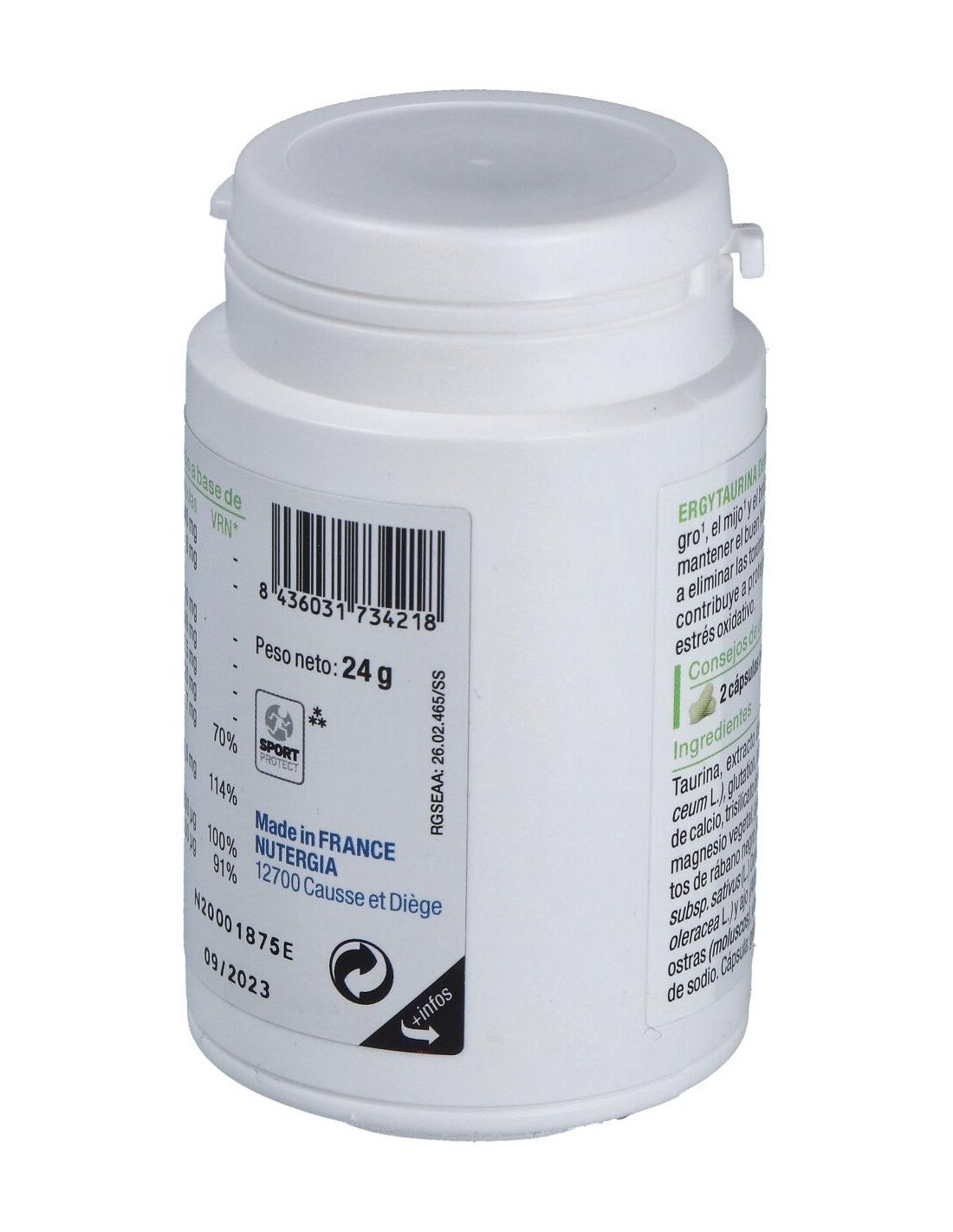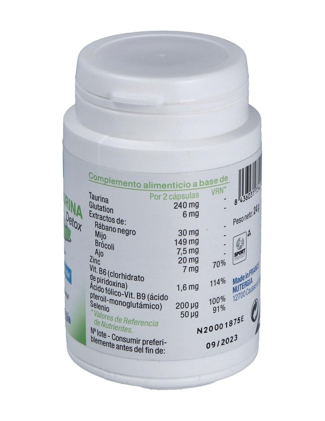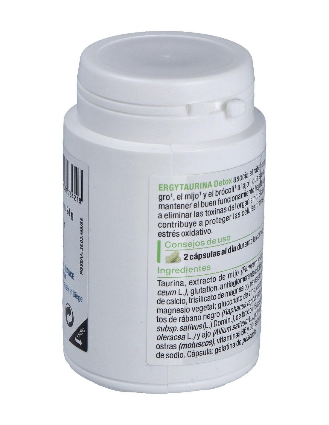 Taurina, extracto de mijo (Panicum miliaceum L.), glutatión, antiaglomerantes: fosfato de calcio, trisilicato de magnesio y estearato de magnesio vegetal: gluconato de zinc, extractos de rábano negro (Raphanus raphanistrum subsp. sativus (L.) Domin.), de brócoli (Brassica oleracea L.) y ajo (Allium sativum L.), polvo de ostras (moluscos), vitaminas B6 y B9, selenita de sodio. Cápsula: gelatina de pescado.