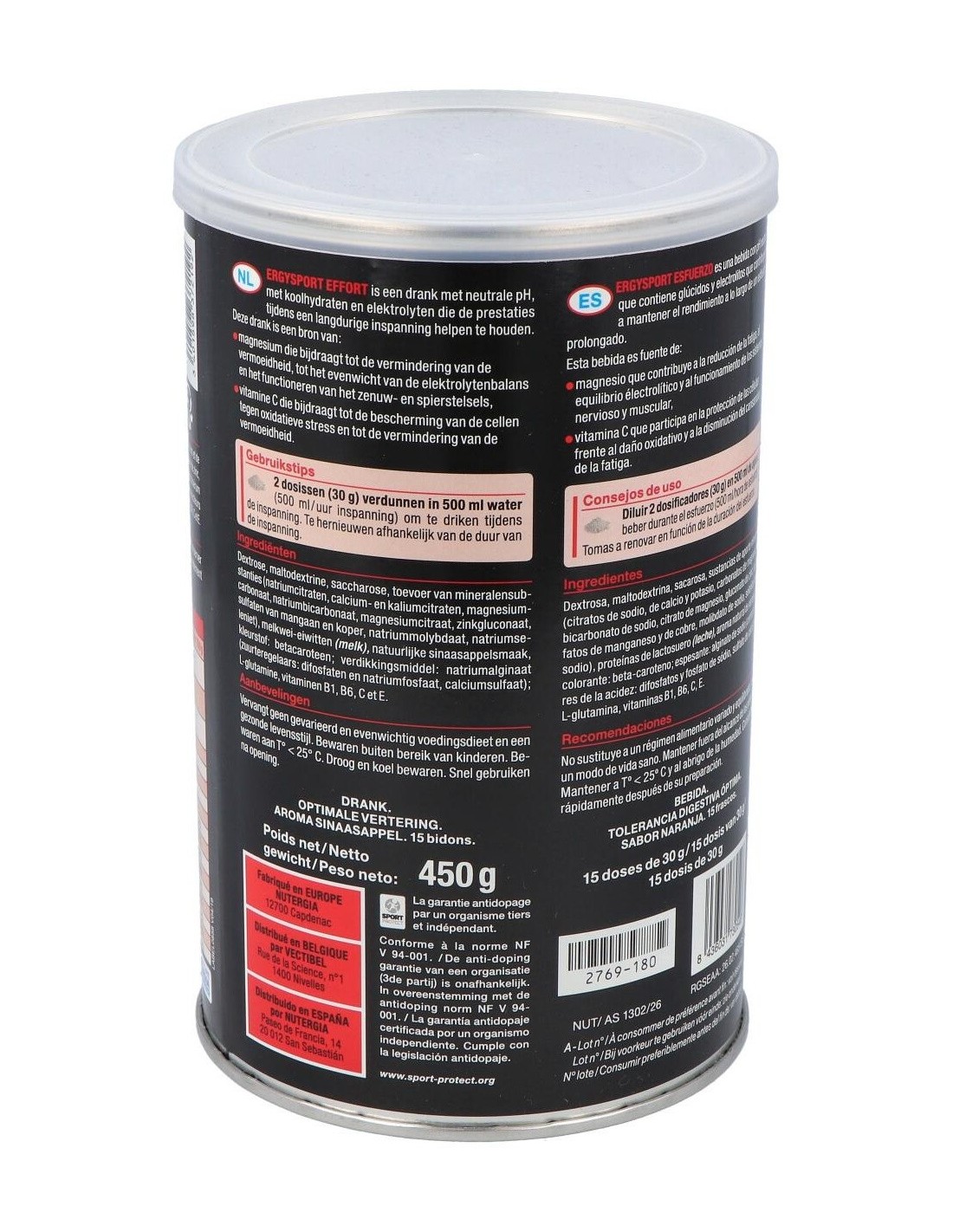 Dextrosa, maltodextrina, fructosa, proteínas de lactosuero, sustancias de aporte mineral (citratos de sodio, de calcio, de potasio, carbonatos de magnesio, bicarbonato de sodio, gluconato de zinc, selenita de sodio, sulfatos de manganeso y de cobre, molibdato de sodio), sabor naranja, sal, espesante: alginato de sodio, glutamina, vitaminas B1, B6, C y E.