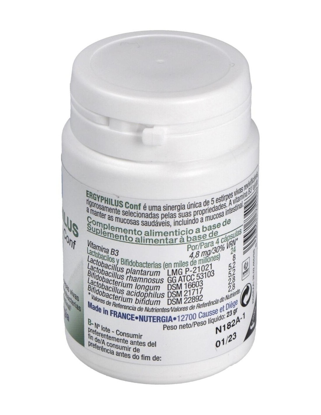 Asociación de lactobacillus y bifidobacterias seleccionadas, en particular L. plantarum y B. longum que contribuyen a mantener el normal equilibrio de la flora intestinal y apoyan el confort digestivo.