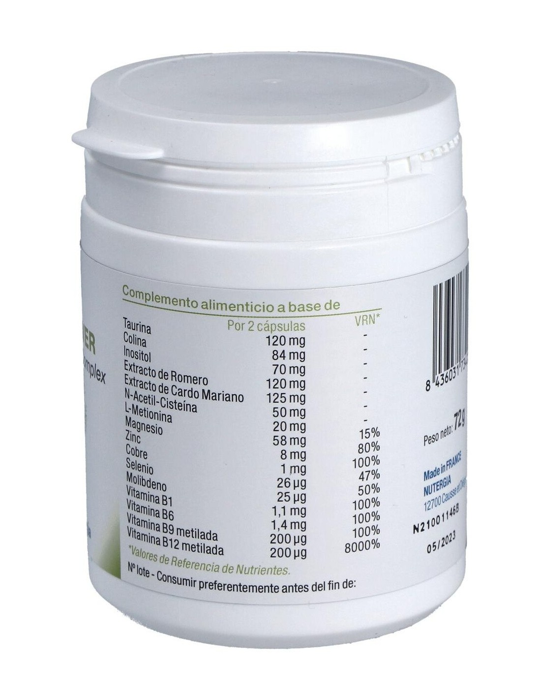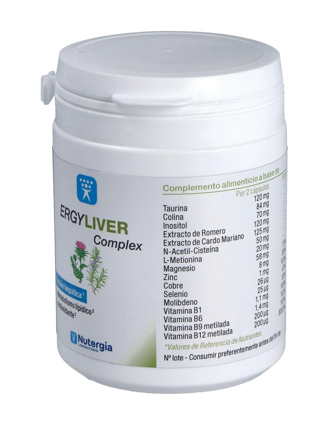 Bitartrato de colina, hidróxido de magnesio, extracto estandarizado de cardo mariano (Silybum marianum L. Gaertn., 80% silimarina), extracto estandarizado de romero (Rosmarinus officinalis L., 50% ácido ursólico), taurina, almidón de patata, inositol, N-Acetil-Cisteina, citrato de zinc, L-metionina, antiaglomerante: estearato de magnesio: gluconato de cobre, Piridoxal-5-Fosfato (vitamina B6), Clorhidrato de Tiamina (vitamina B1), molibdato de sodio, selenita de sodio, L-Metilfolato de calcio (vitamina B9), Metilcobalamina (vitamina B12). Cápsula: gelatina de pescado.