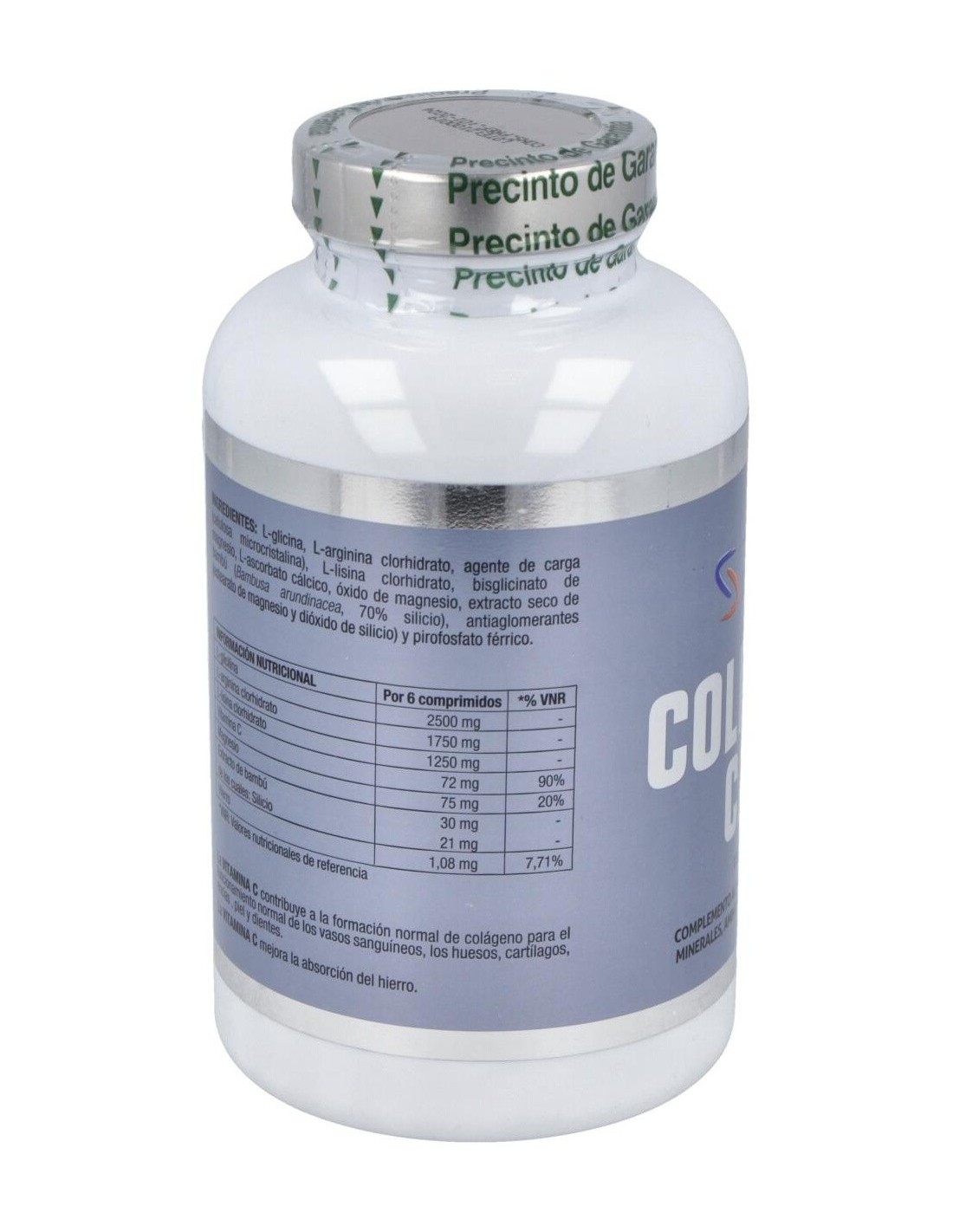 Complemento alimenticio a base de aminoácidos, vitamina C, hierro, silicio y magnesio. La vitamina C contribuye a la formación normal de colágeno para el funcionamiento normal de los vasos sanguíneos, los huesos, cartílagos, encías , piel y dientes. Apto para veganos.