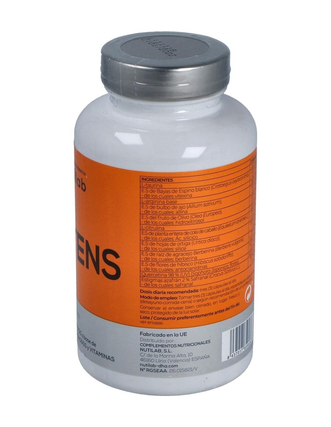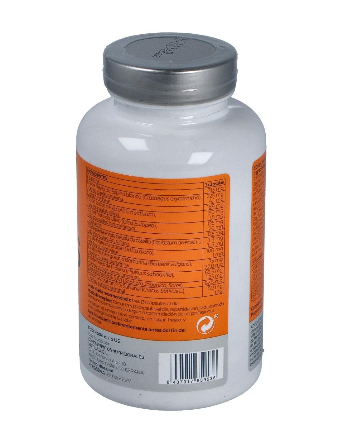 Cápsula vegetal: agente de recubrimiento (hidroxipropilmetilcelulosa), L-taurina, inosina, ext. seco de bayas de espino blanco (Crataegus oxyacantha), L-arginina base, bisglicinato de magnesio (magnesio), bicarbonato potásico (potasio), ext. seco de bulbo de ajo (Allium sativum), ext. seco del fruto de olivo (Olea Europea), L citrulina, ext. seco de planta entera de cola de caballo (Equisetum arvense L.), ext. seco de hojas de ortiga (Urtica dioca), ext. seco de raíz de agracejo berberina (Berberis vulgaris), ext. seco de flores de hibisco (Hibiscus sabdariffa), quercetina 98 % (UV) (Sophora Japonica, flores), ácido L-ascórbicom (vitamina C), estigmas de azafrán 2 % Safranal (Crocus Sativus L.), agente de carga (celulosa microcristalina), óxido de magnesio (magnesio), antiaglomerantes (estearato de magnesio vegetal y dióxido de silicio), nicotinamida (niacina), citrato de zinc (zinc), metilcobalamina (vitamina B12), clorhidrato de piridoxina (vitamina B6), sulfato de cobre (cobre), colecalciferol (vitamina D3), riboflavina (vitamina B2) y L-metilfolato cálcico (ácido fólico).