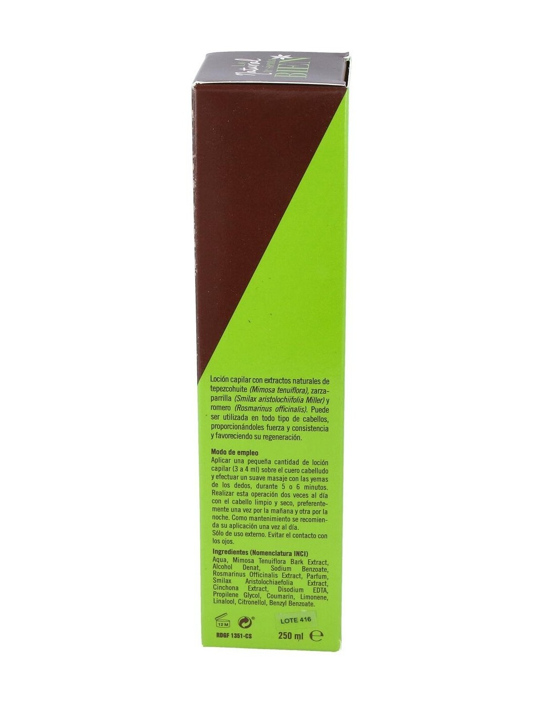 Loción capilar con extractos naturales de tepezcohuite (Mimosa tenuiflora), zarzaparrilla (Smilax aristolochiifolia Miller) y romero (Rosmarinus officinalis). Puede ser utilizada en todo tipo de cabellos, proporcionándoles fuerza y consistencia.