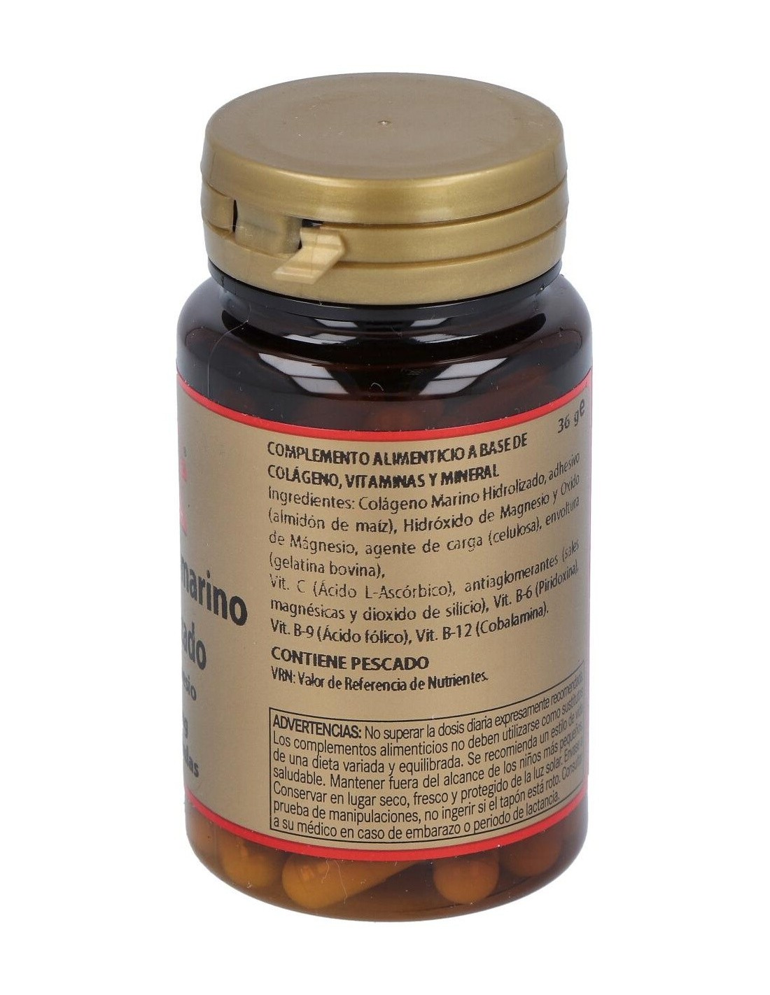 COLÁGENO MARINO HIDROLIZADO, HIDRÓXIDO DE MAGNESIO (90 MG) ÓXIDO DE MAGNESIO (33 MG)AMBOS APORTAN 57,39 MG DE MG (15,30 % VRN), VITAMINA C :20 MG (25 % VRN), VITAMINA B-6: 1,4 MG (100 % VRN), VITAMINA B-9: 0,20 MG (100 % VRN), VITAMINA B-12:0,0025 MG (100 % CDR), ALMIDÓN DE MAÍZ, CELULOSA MICROCRISTALINA, ESTEARATO DE MAGNESIO, DIOXIDO DE SILICIO Y GELATINA.