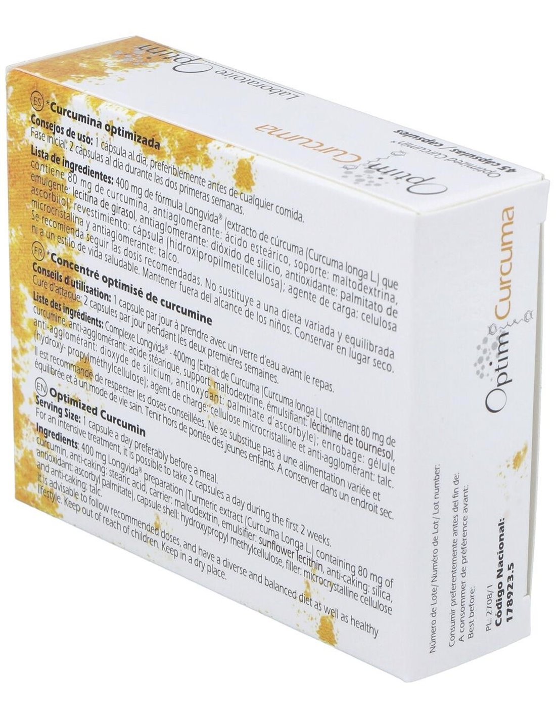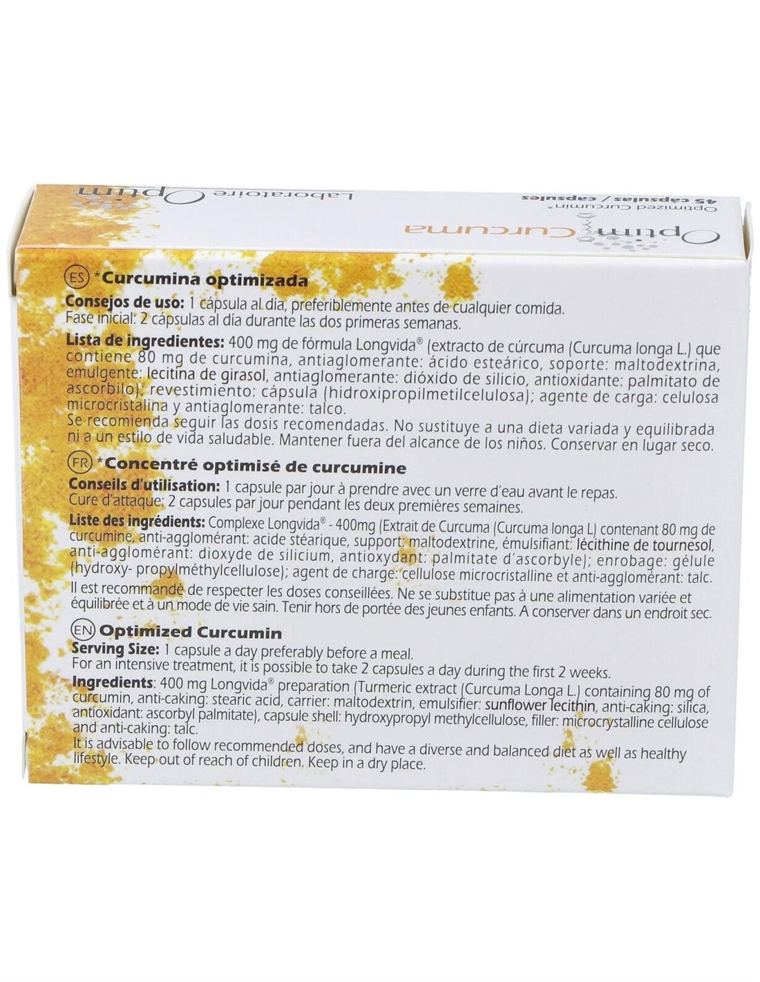400 mg de fórmula Longvida (extracto de cúrcuma (Curcuma longa L. ) que contiene 80 mg de curcumina, antiaglomerante: ácido esteárico, soporte: maltodextrina, emulgente: lecitina de soja, antioxidante: palmitato de ascorbilo, antiaglomerante: dióxido de silicio); revestimiento: Cápsula (hidroxipropilmetilcelulosa); antiaglomerante: talco y agente de carga: celulosa microcristalina.