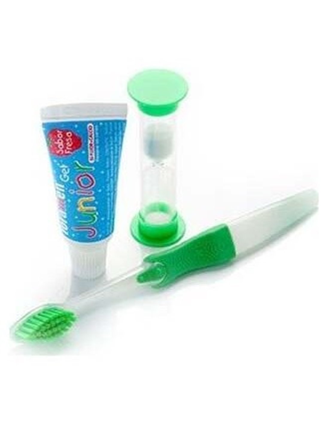 Compuesto por un cepillo de tamaño pequeño y con filamentos muy pequeños y suaves adaptados al tamaño de su dentadura (cepillo desprende una aroma a fresa que hace muy agradable el olor hacia los niños), una pasta dental junior con sabor a fresa y un reloj de arena. El kit va dentro de un práctico neceser, muy útil para viajes o para llevar al colegio dentro de la mochila.