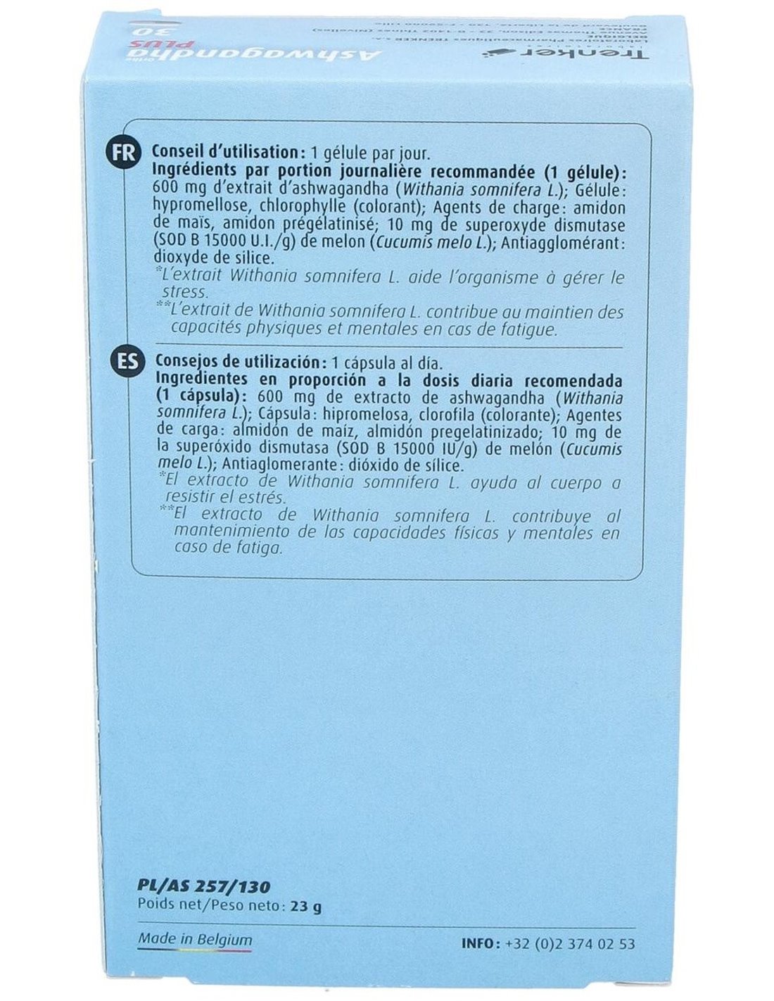 600 mg Ashwagandha KSM-66®estandarizada (raíz) con un porcentaje de withanólidos superior al 5% y witaferina A, inferior al 0,1 %