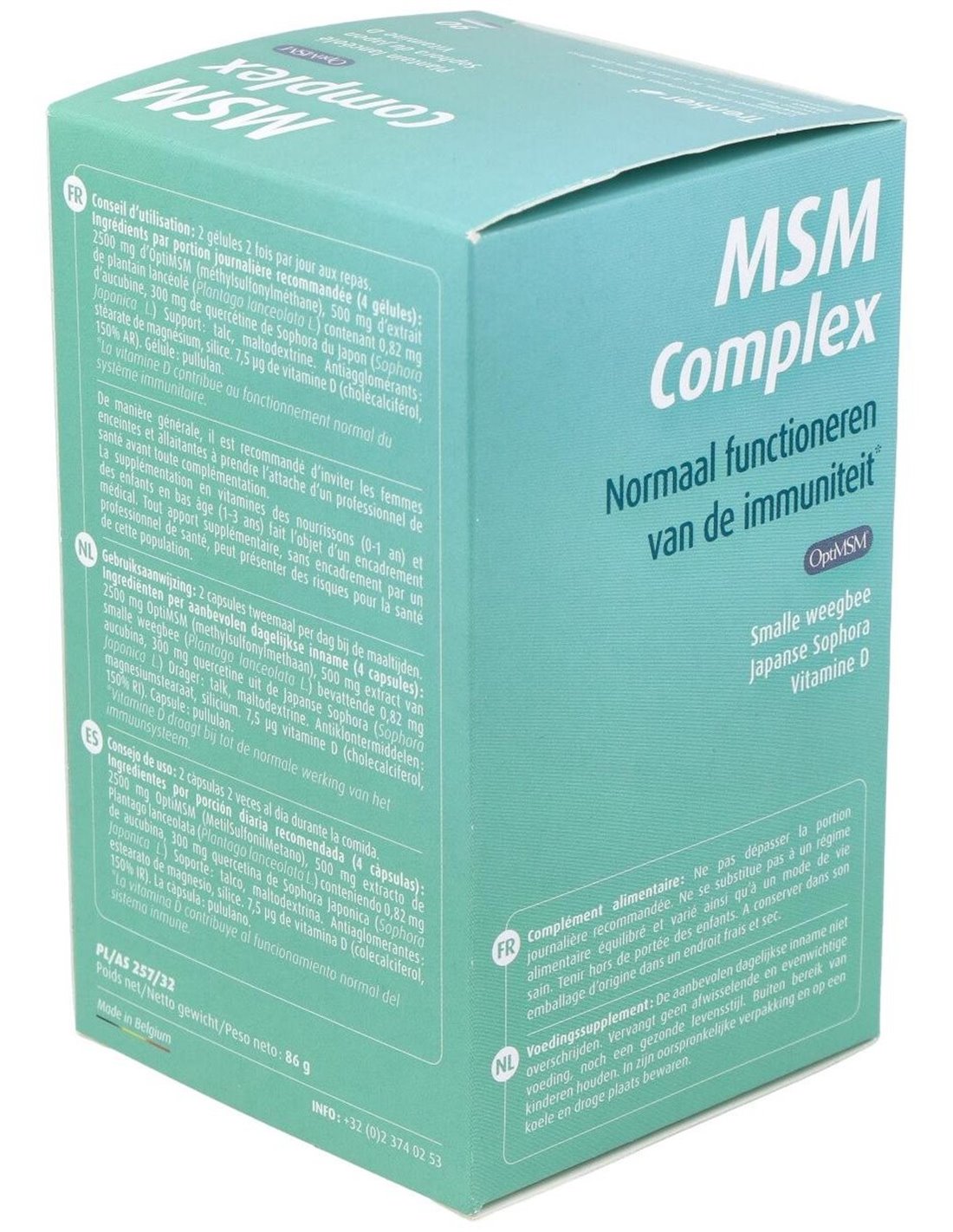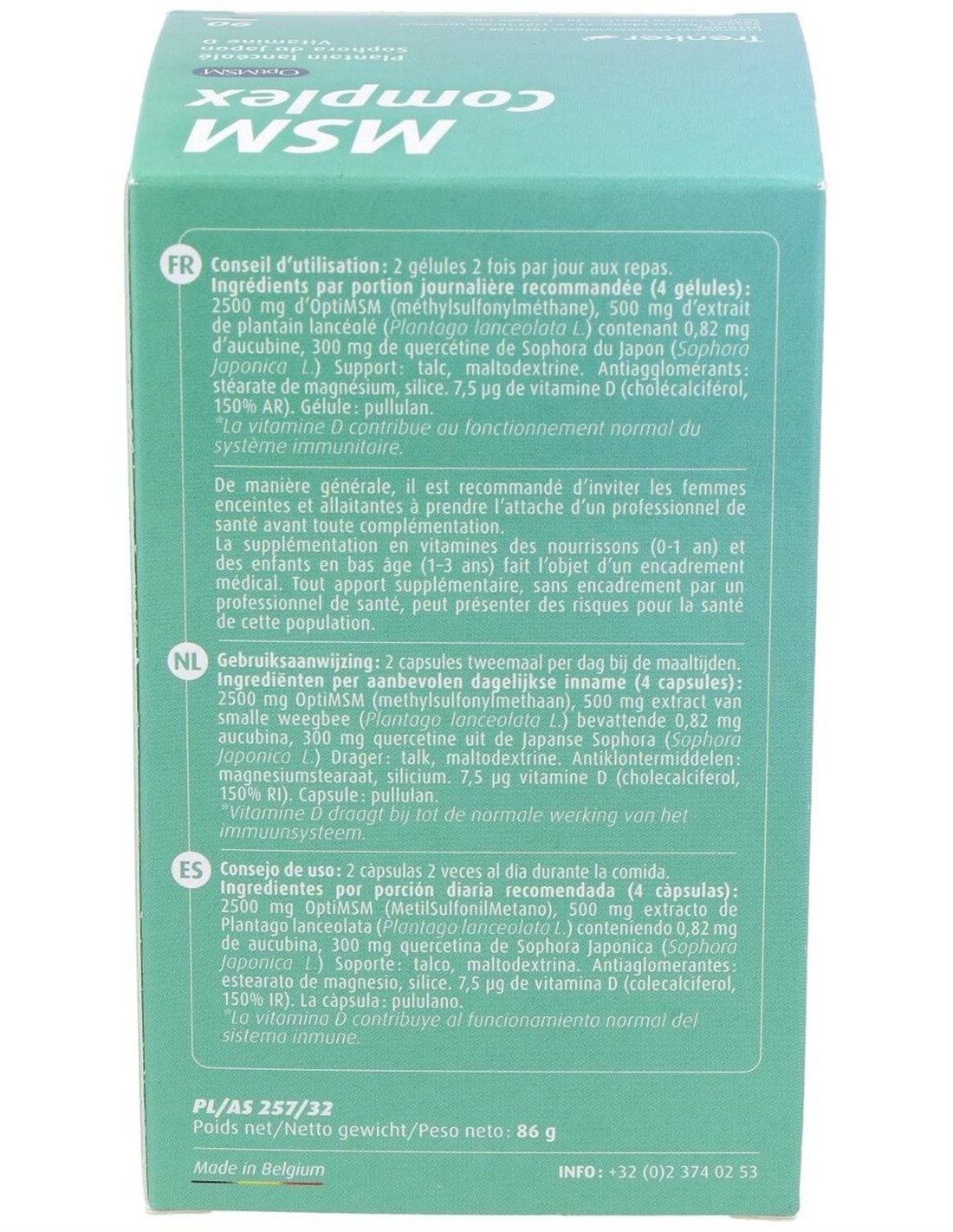 625 mg. Opti MSM (MetilSulfonilMetano, calidad OPTI, exento de disolventes de extracción).