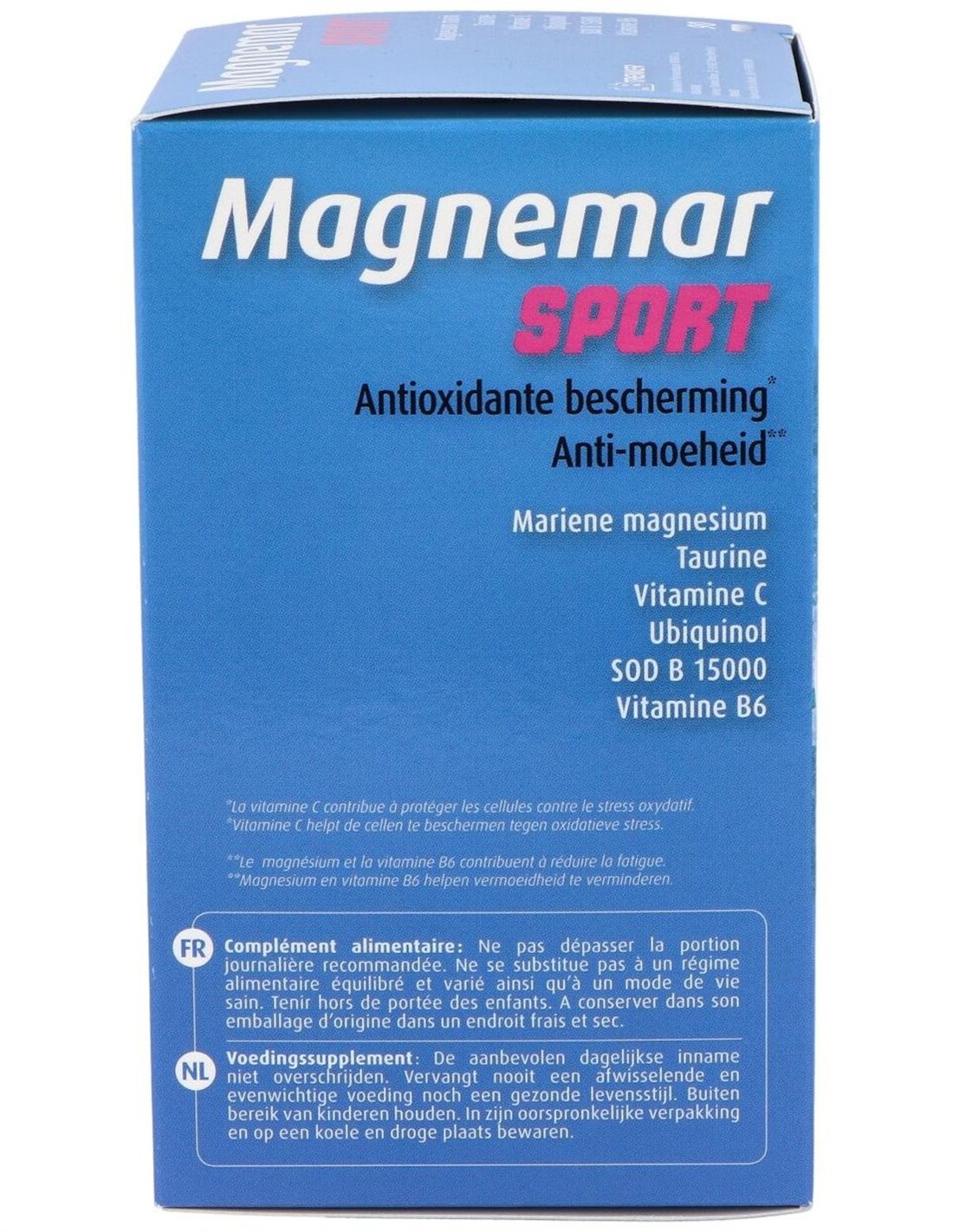 Complemento alimenticio en formato cápsula a base de minerales y vitaminas, con magnesio de origen marino, que ha sido especialmente desarrollado para satisfacer las necesidades de magnesio de los deportistas. La falta de magnesio puede llevar a la fatiga muscular y a la aparición de calambres o espasmos musculares, por lo que está recomendado aportar este mineral para evitar llegar a estos estados.