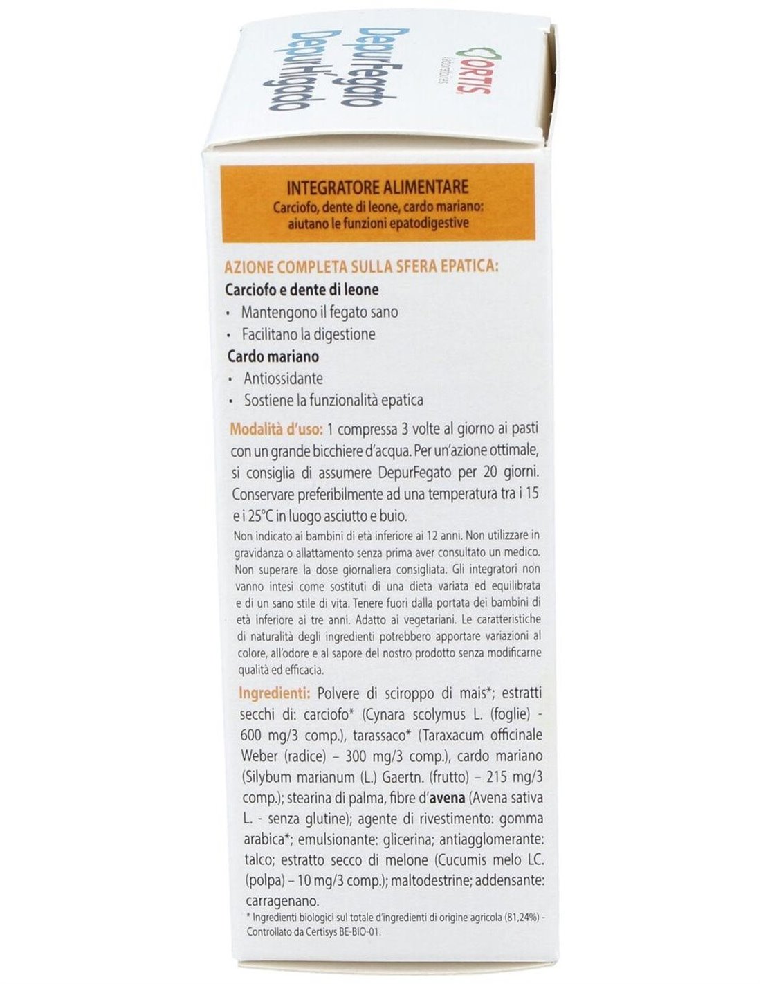 Polvo de sirope de maíz*: extractos secos de: alcachofa* (Cynara scolymus L. 600 mg/3 comp.), diente de león* (Taraxacum officinale Weber 300 mg/3 comp.), cardo mariano (Silybum marianum (L.) Gaertn. 215 mg/3 comp.): estearina vegetal*, fibras de avena*: agente de recubrimiento: fibras de acacia*: emulsificante: glicerina: antiaglomerantes: talco, dióxido de silicio: extracto seco de melón (Cucumis melo LC. 10 mg/3 comp.), maltodextrina: espesante: carragenano.