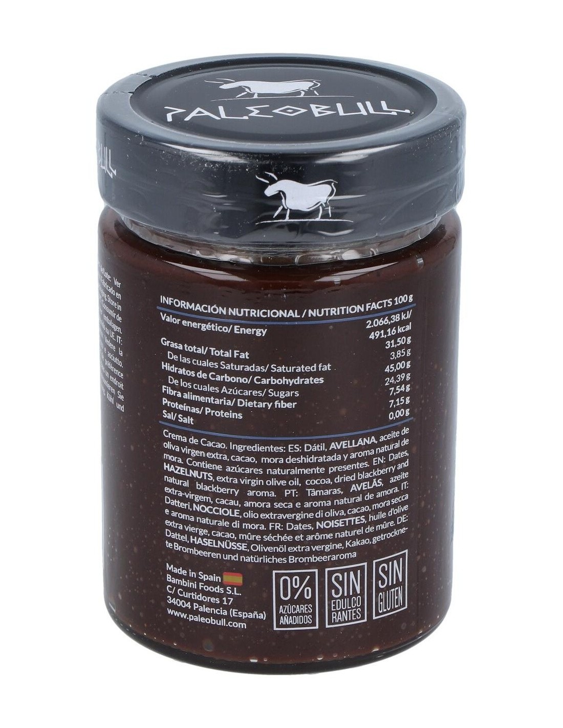 Crema de cacao y avellanas saludable, elaborada con dátiles, cacao, avellanas, aceite de oliva virgen extra (AOVE) y mora. Sin azúcares añadidos y sin edulcorantes.