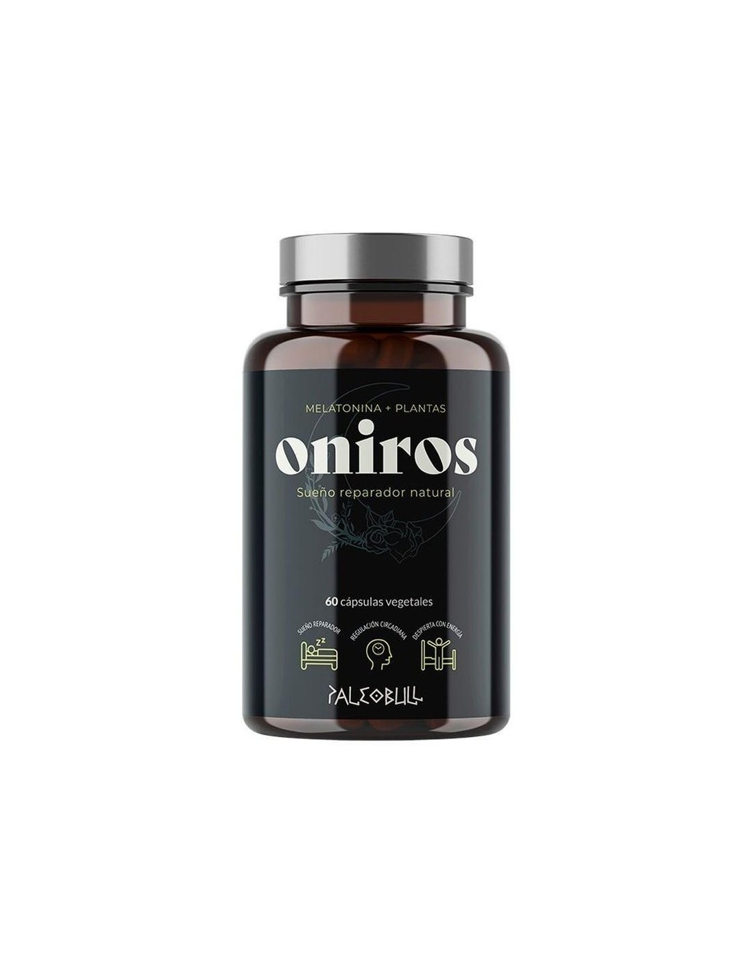 PALEOBULLOniros es un suplemento concebido para el descanso natural. Se trata de una fórmula exclusiva elaborada con melatonina (1,9 mg por cápsula), una combinación perfecta de 5 extractos herbales, glicina, magnesio y vitamina B6. La melatonina contribuye a aliviar la sensación subjetiva de desfase horario (jet lag) y disminuir el tiempo necesario para conciliar el sueño. La Vitamina B6 y el magnesio ayudan al metabolismo energético normal y a disminuir el cansancio y la fatiga. Además, la fórmula exclusiva de Oniros está elaborada con extractos de 5 plantas utilizadas desde tiempos remotos por diversas culturas ancestrales.