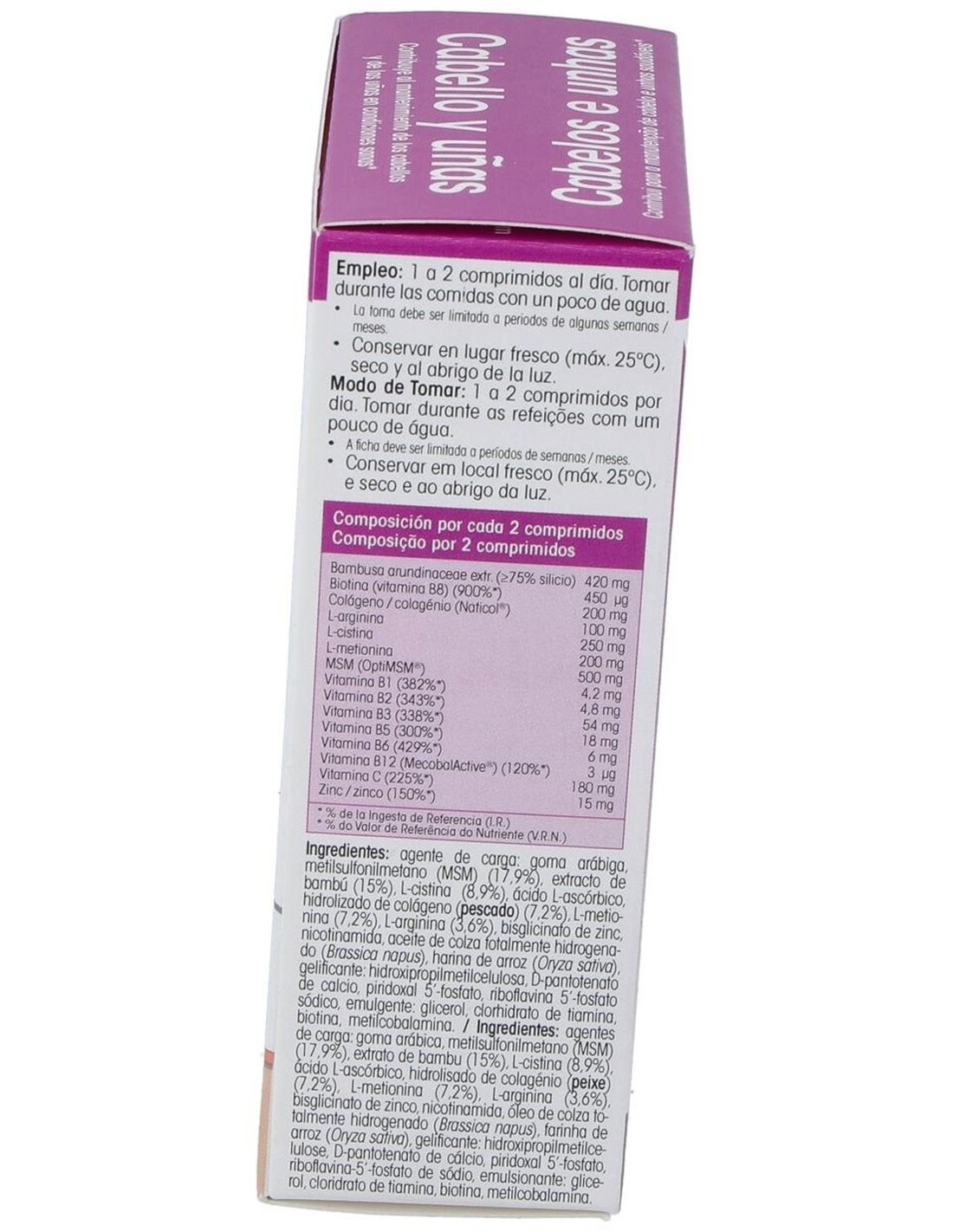 Complejo natural nutritivo que contiene zinc en forma de quelato (biodisponibilidad máxima) que contribuye a la belleza y a la salud del cabello y de las uñas. La biotina (o vitamina H) y la vitamina B6 apoyan el metabolismo de las proteínas mientras que la vitamina C y el zinc participan en la protección de las células contra los radicales libres. Contiene también silicio orgánico del bambú, un hidrolizado de colágeno tipo 1 (Naticol®), L-arginina, MMS y aminoácidos sulfurados L-cistina y L-methionina.
