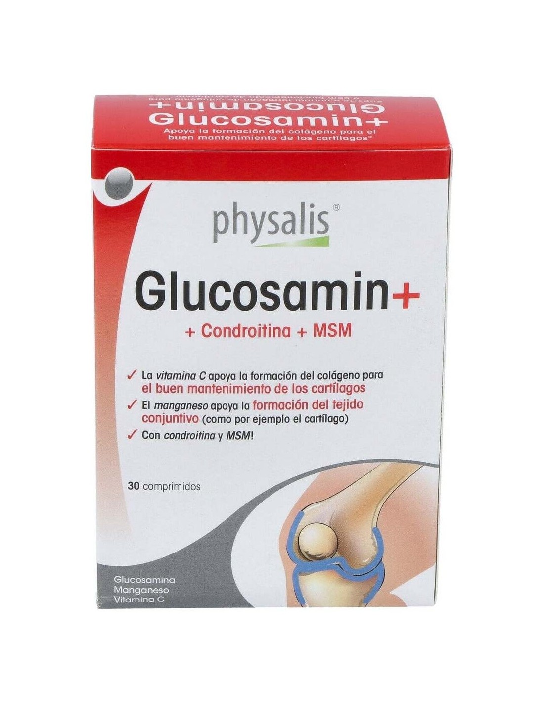 PHYSALISContiene glucosamina y condroitina, los principales constituyentes del cartílago. La vitamina C ayuda a la formación del colágeno, contribuyendo así al normal mantenimiento del cartílago articular. El manganeso apoya la formación de los tejidos conjuntivos, entre otros el cartílago. Contiene también MSM.