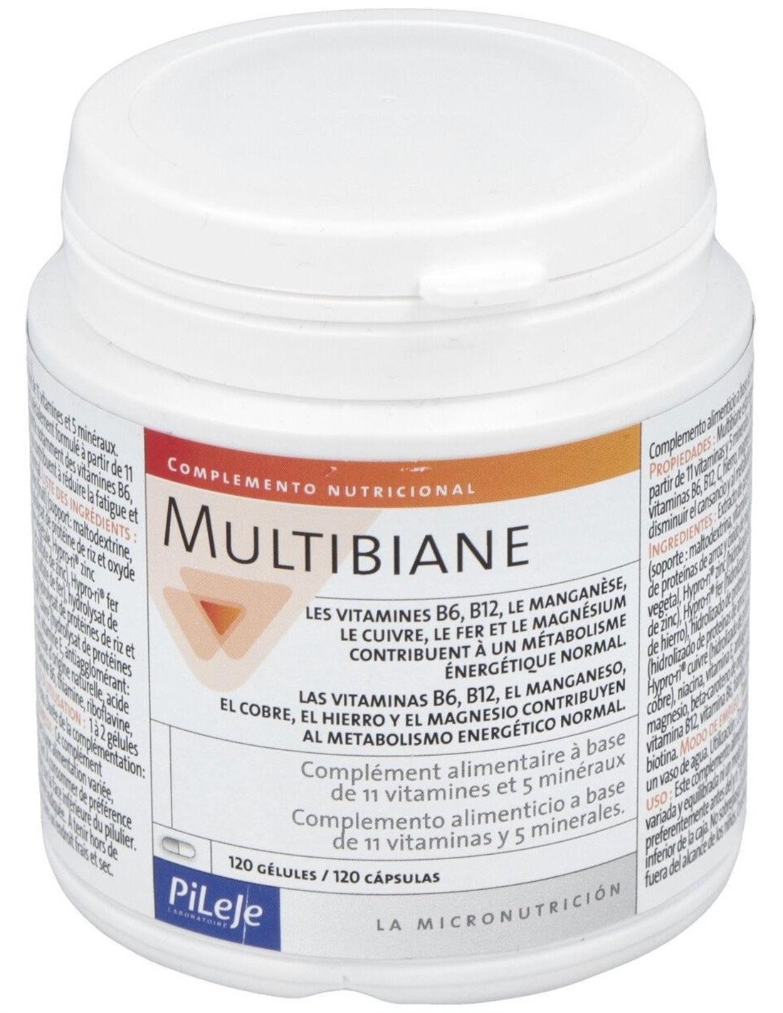 Multibiane es un complemento alimenticio que aporta 11 vitaminas y minerales para contribuir al funcionamiento óptimo del sistema inmunitario (vitaminas A, B6, B12 y C) y ayuda a la reducción del cansancio (vitaminas C, B6, B12, folatos, niacina y magnesio).