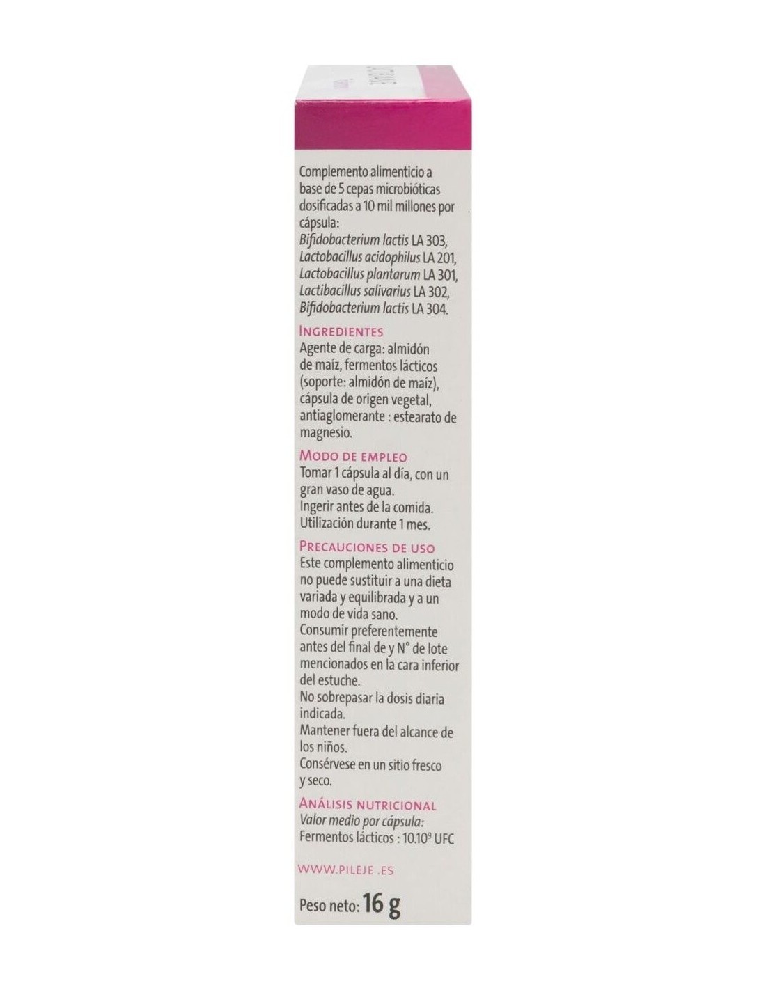 FÉCULA DE PATATA, INULINA DE ACHICORIA, MALTODEXTRINA DE MAÍZ, FERMENTOS LÁCTICOS. AGENTE DE CARGA: ALMIDÓN DE MAÍZ, FERMENTOS LÁCTICOS (SOPORTE: MALTODEXTRINAS), CÁPSULA DE ORIGEN VEGETAL, ANTIAGLOMERANTE: ESTEARATO DE MAGNESIO.