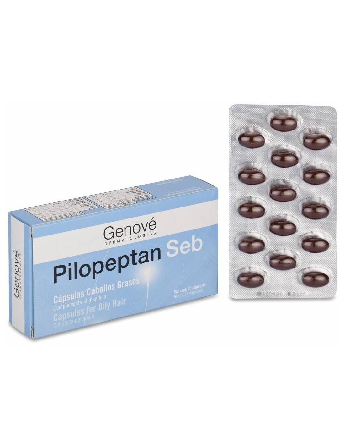 Pilopeptan Seb es una solución especialmente diseñada para las caídas capilares de tipo seborreico, ya que la secreción de sebo agrava cualquier tipo de cuadro alopécico. Gracias a su formulación rica en sustancias de origen vegetal, este producto restaurará la película hidrolipídica de tu cuero cabelludo y fortalecerá la fibra capilar para evitar su rotura y debilitamiento. Además, estas cápsulas te ayudarán a combatir la fragilidad de las uñas y mantener en buen estado el cutis.