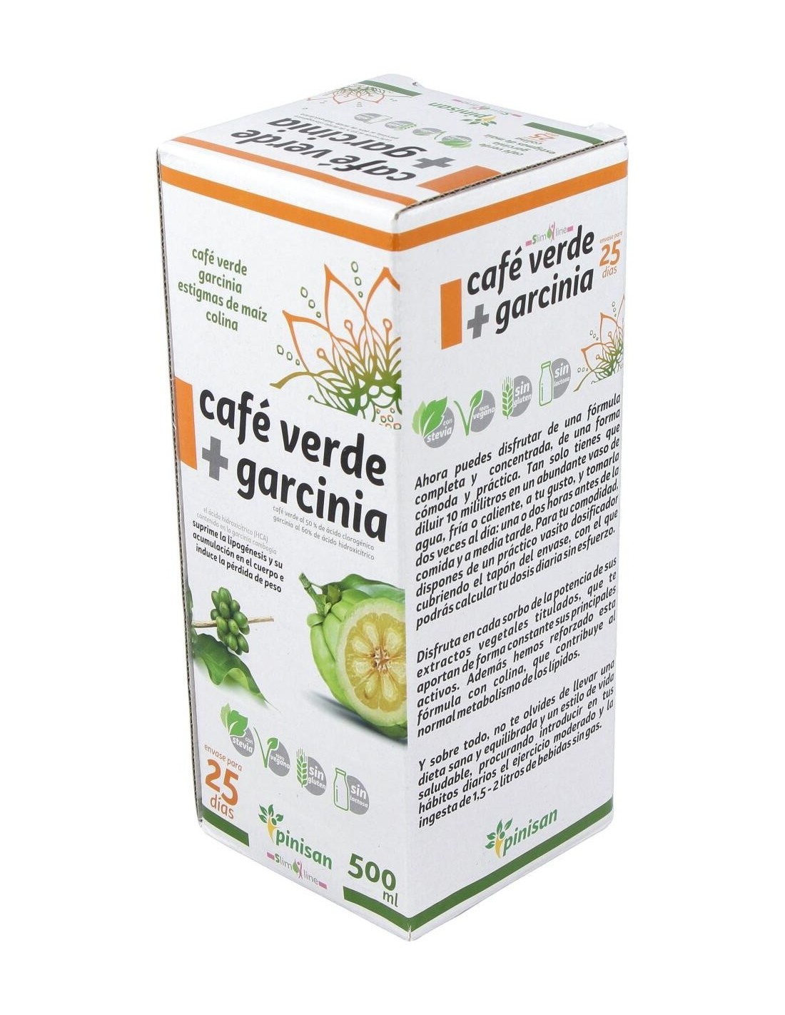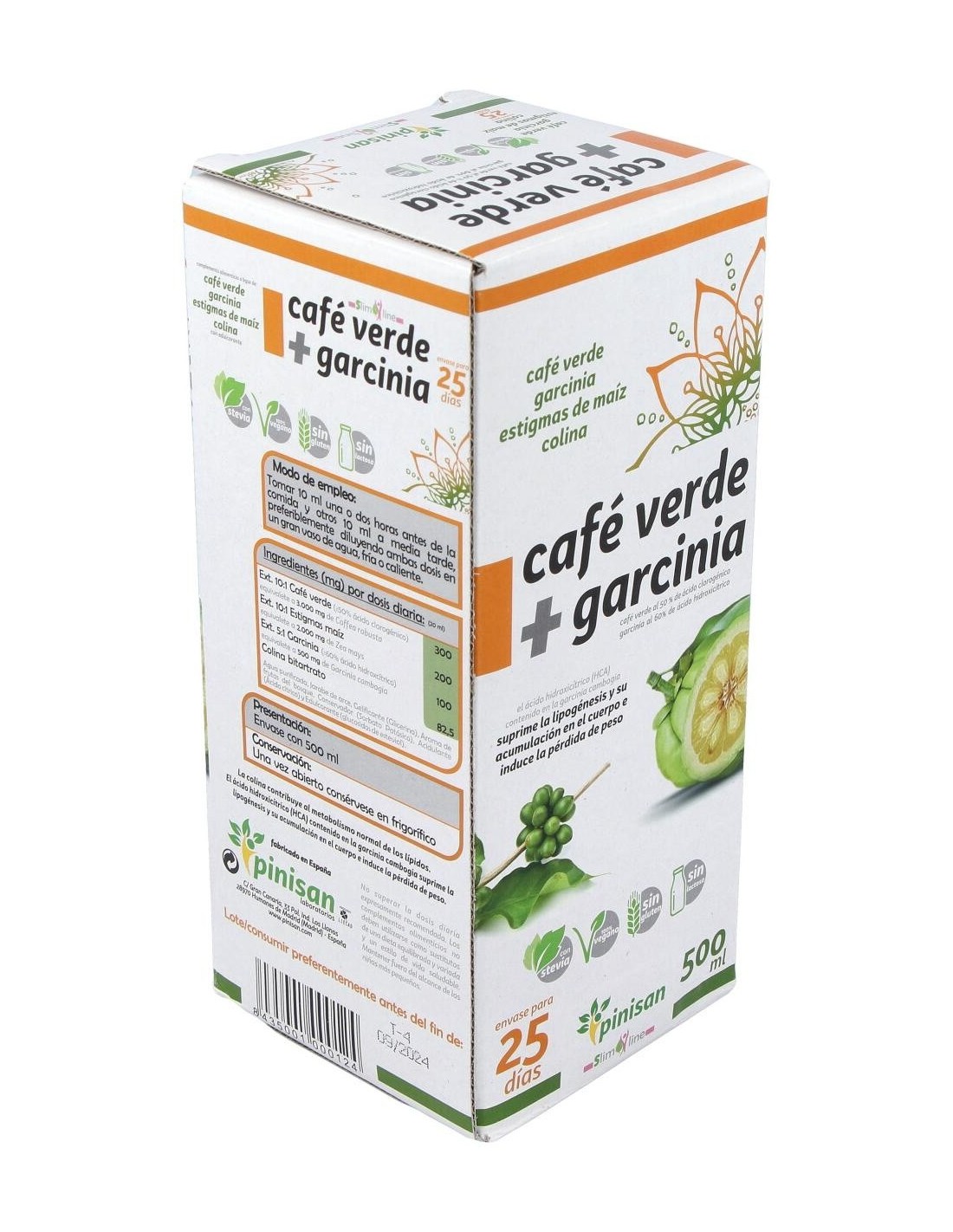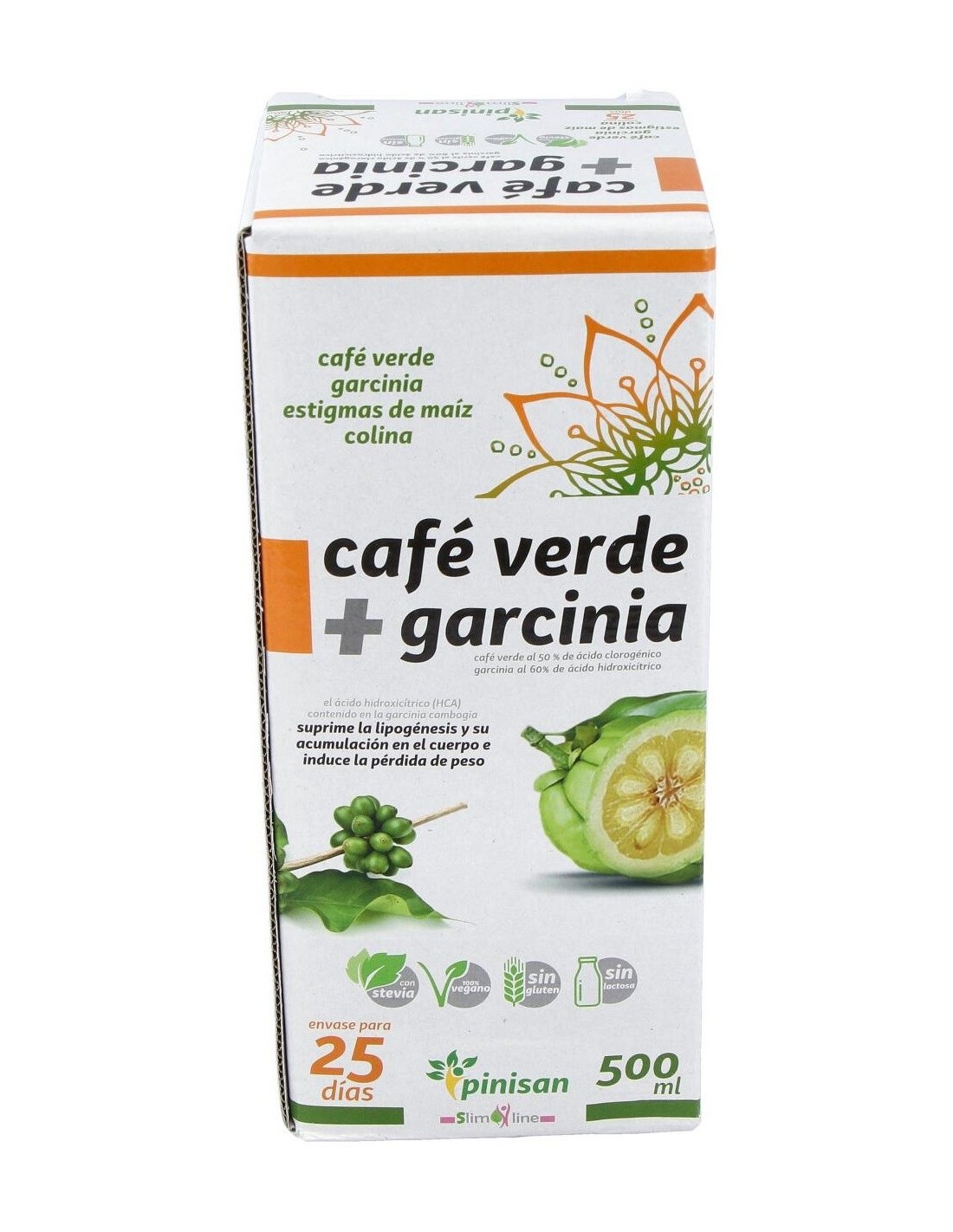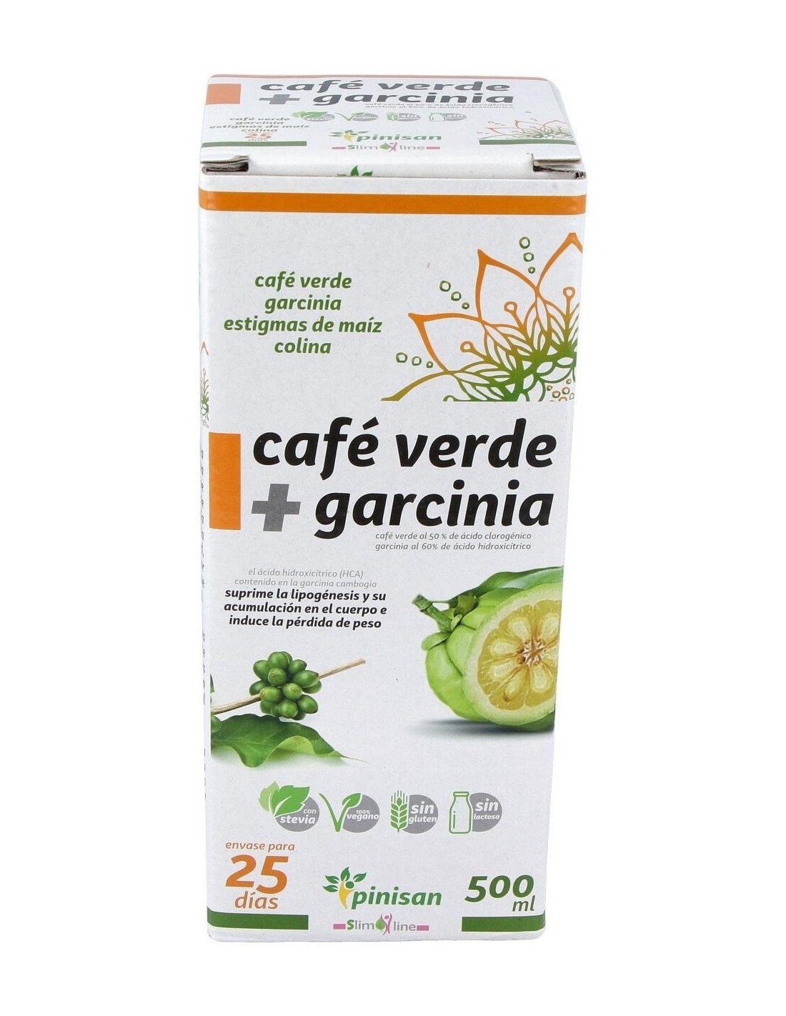 Complemento nutricional idóneo para favorecer la pérdida de peso por su gran poder quemagrasas, diurético y drenante. Elaborado con Café Verde + Garcinia de Pinisan, y edulcorado con Stevia. El Café Verde es el grano del café sin tostar y tiene alto contenido en ácido clorogénico, el cual evita la infiltración de grasa y activa la enzima adenylate cyclose, que es capaz de estimular el metabolismo de los lípidos. Favorece la pérdida de peso al saciar el apetito. Además el ácido clorogénico tiene un efecto beneficioso sobre el metabolismo de la glucosa, ya que se reduce su absorción y disminuye el máximo hiperglucémico, al interferir en la actividad de enzimas digestivas del intestino, aumentando el nivel de azúcares y grasas eliminados. Entre otros muchos más beneficios, además es un excelente antioxidante.