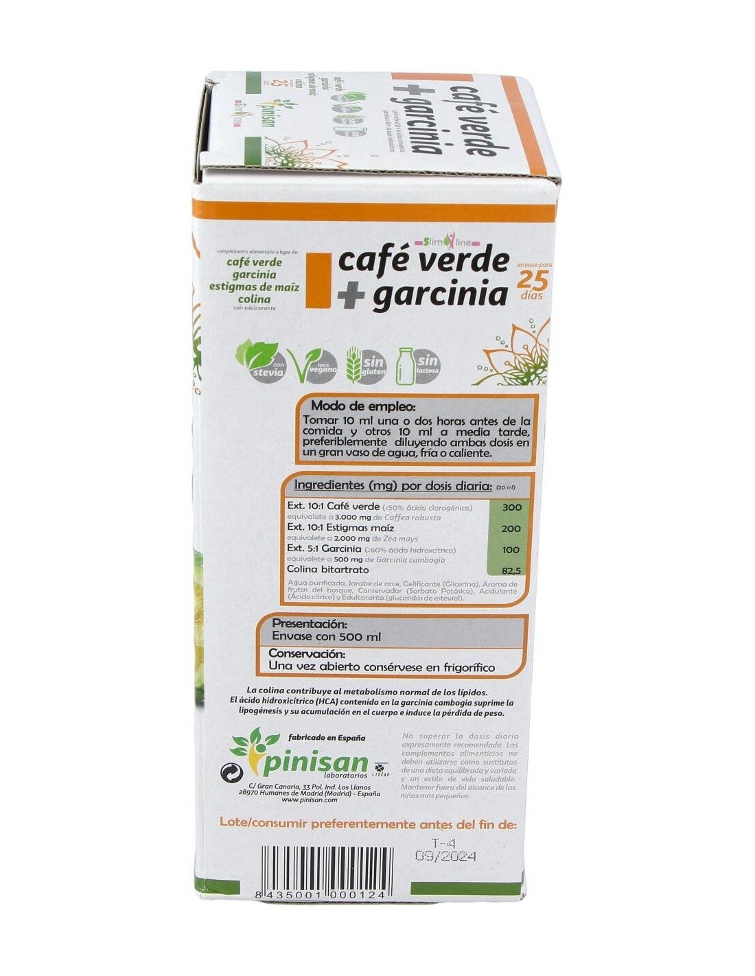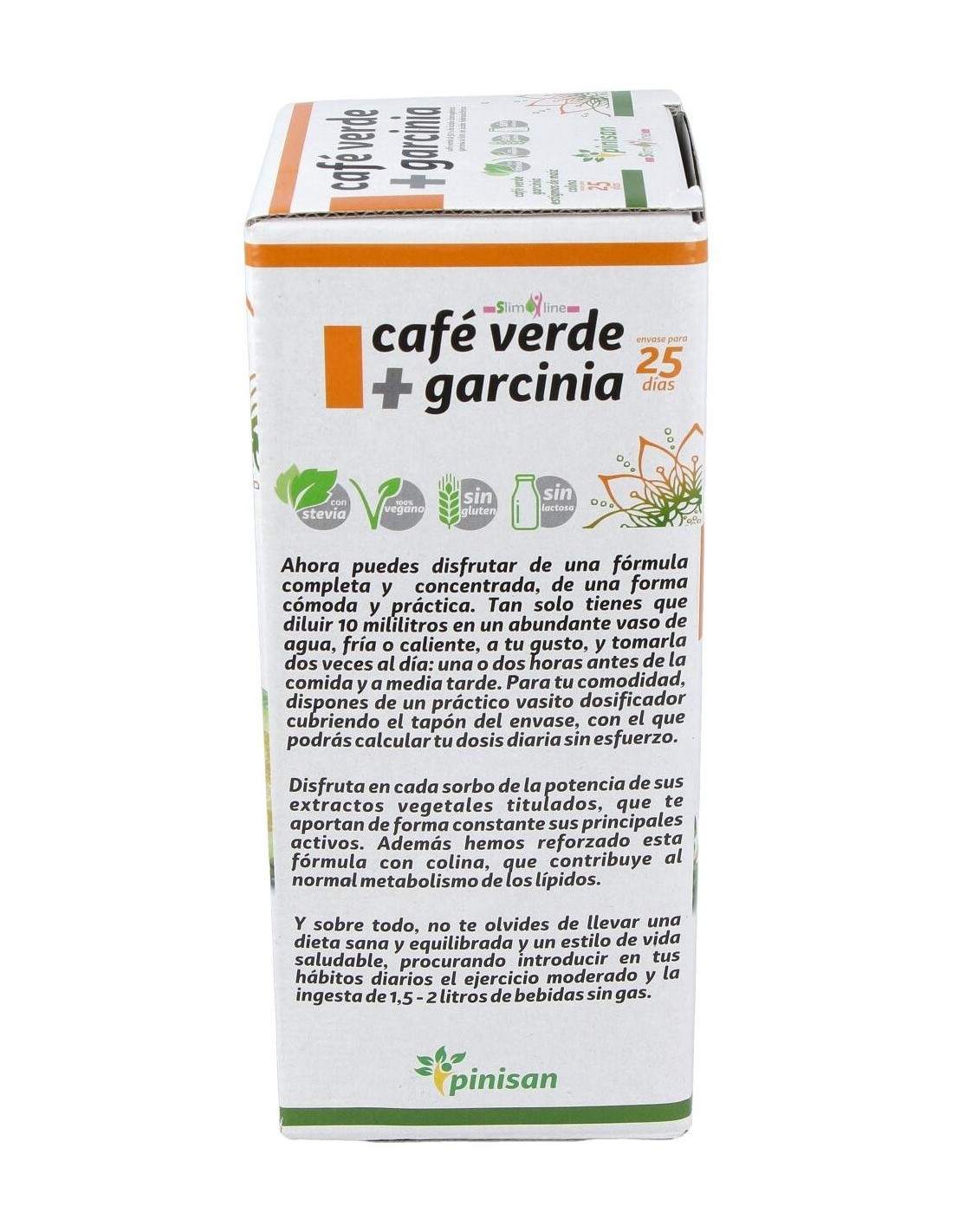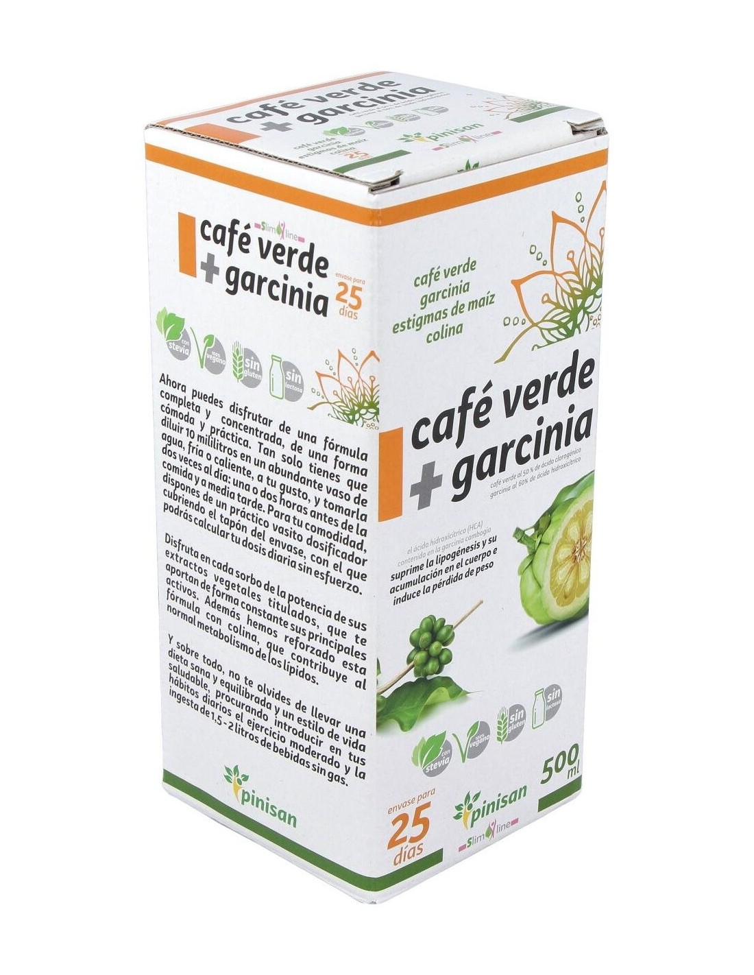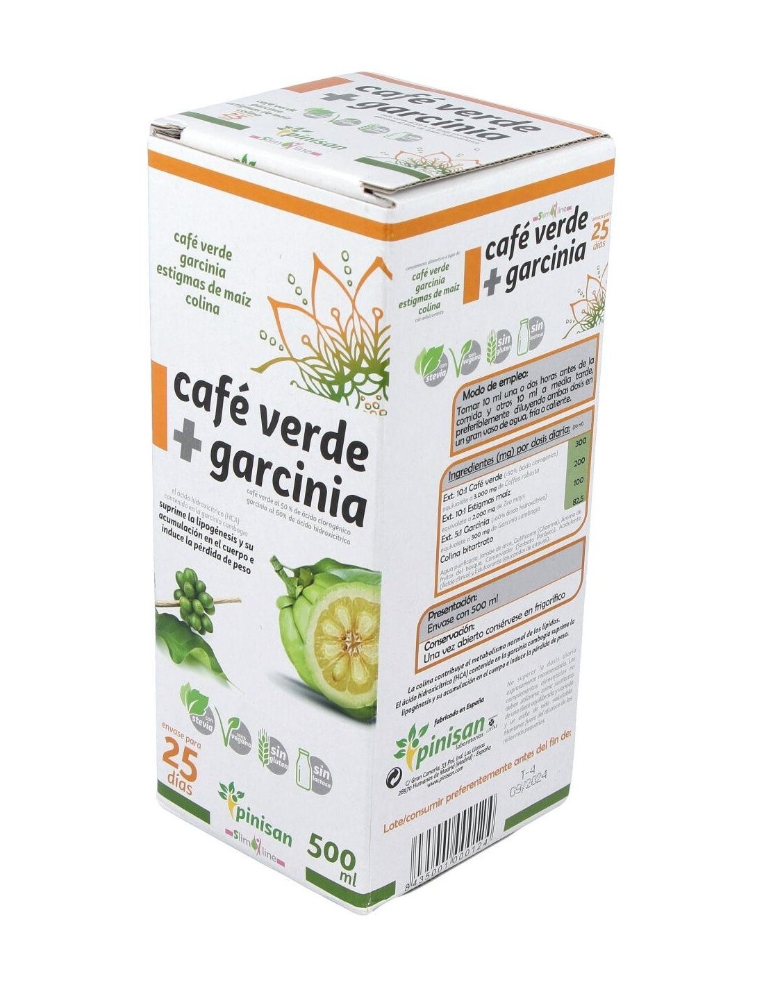 Complemento nutricional idóneo para favorecer la pérdida de peso por su gran poder quemagrasas, diurético y drenante. Elaborado con Café Verde + Garcinia de Pinisan, y edulcorado con Stevia. El Café Verde es el grano del café sin tostar y tiene alto contenido en ácido clorogénico, el cual evita la infiltración de grasa y activa la enzima adenylate cyclose, que es capaz de estimular el metabolismo de los lípidos. Favorece la pérdida de peso al saciar el apetito. Además el ácido clorogénico tiene un efecto beneficioso sobre el metabolismo de la glucosa, ya que se reduce su absorción y disminuye el máximo hiperglucémico, al interferir en la actividad de enzimas digestivas del intestino, aumentando el nivel de azúcares y grasas eliminados. Entre otros muchos más beneficios, además es un excelente antioxidante.