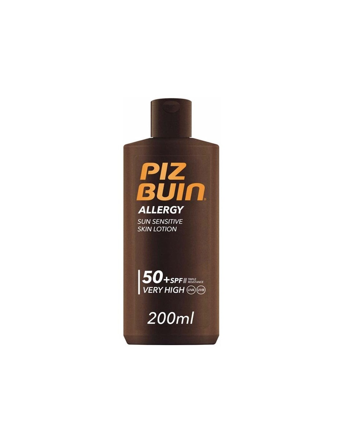 Piz Buin® Allergy SPF50+ Loción Piel Sensible 200ml es una loción que ha sido especialmente desarrollada para la piel sensible al sol que, gracias al avanzado sistema de filtros solares UVA y UVB de Piz Buin, protege eficazmente hasta las pieles más intolerantes y proporciona horas de hidratación para calmar las pieles sensibles.