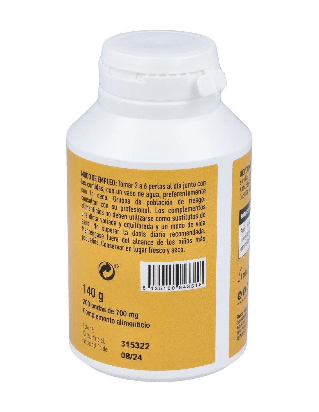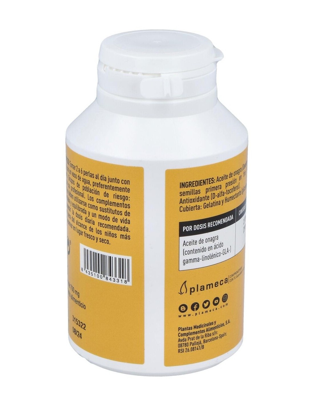 Aceite de onagra (Oenothera biennis) semillas primera presión en frío 10% GLA, Antioxidante (D-alfa-tocoferol (Vitamina E)). Cubierta: Gelatina y Humectante (glicerina).