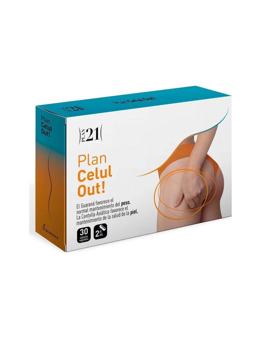 Plan Celul Out! es el producto específico de la línea Plan 21 (control de peso) para atacar la celulitis gracias a su triple función: acción quemagrasa, necesaria para reducir la cantidad de grasa acumulada en los adipocitos, acción sobre el tejido conectivo dañado por la excesiva acumulación de grasa, resultando en la formación de los característicos nódulos de la celulitis, y acción sobre la microcirculación, comprometida por la deformación del tejido conectivo.Composición activa por 2 cápsulas: