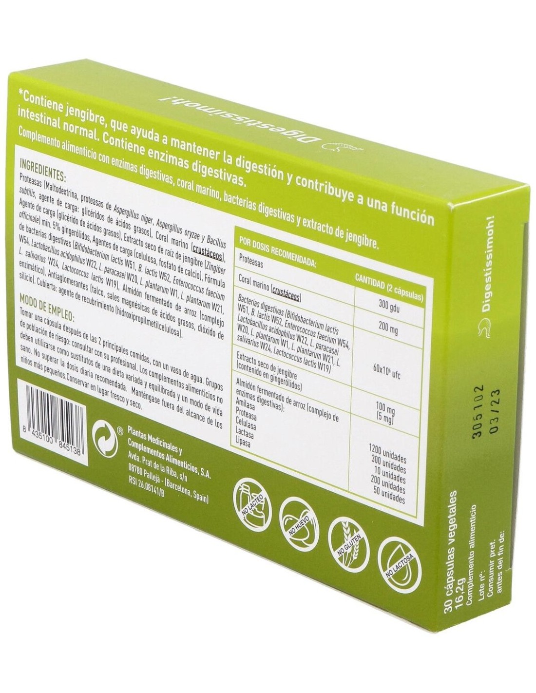 Proteasas (agente de carga: maltodextrina, proteasas de Aspergillus niger, Aspergillus oryzae y Bacillus subtilis, agente de carga: glicéridos de ácidos grasos), Coral marino (crustáceos), Extracto seco de raíz de jengibre (Zingiber officinale) mín. 5% gingerólidos, Agentes de carga (celulosa, glicérido de ácidos grasos, fosfato de calcio), Fórmula de bacterias digestivas (Bifidobacterium lactis W51, B. lactis W52, Enterococcus faecium W54, Lactobacillus acidophilus W22, L. paracasei W20, L. plantarum W1, L. plantarum W21, L. salivarius W24, Lactococcus lactis W19), Almidón fermentado de arroz (complejo enzimático), Antiaglomerantes (sales magnésicas de ácidos grasos, dióxido de silicio). Cubierta: hidroxipropilmetilcelulosa.