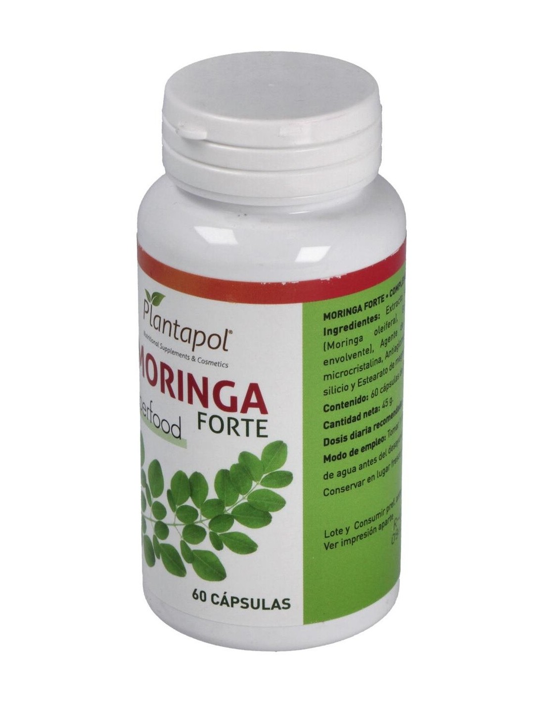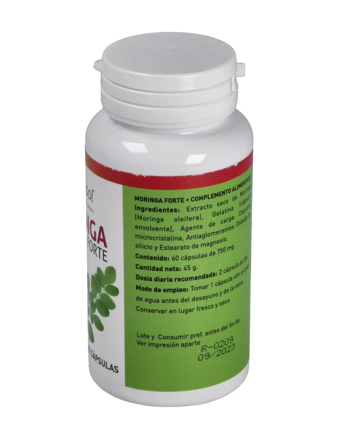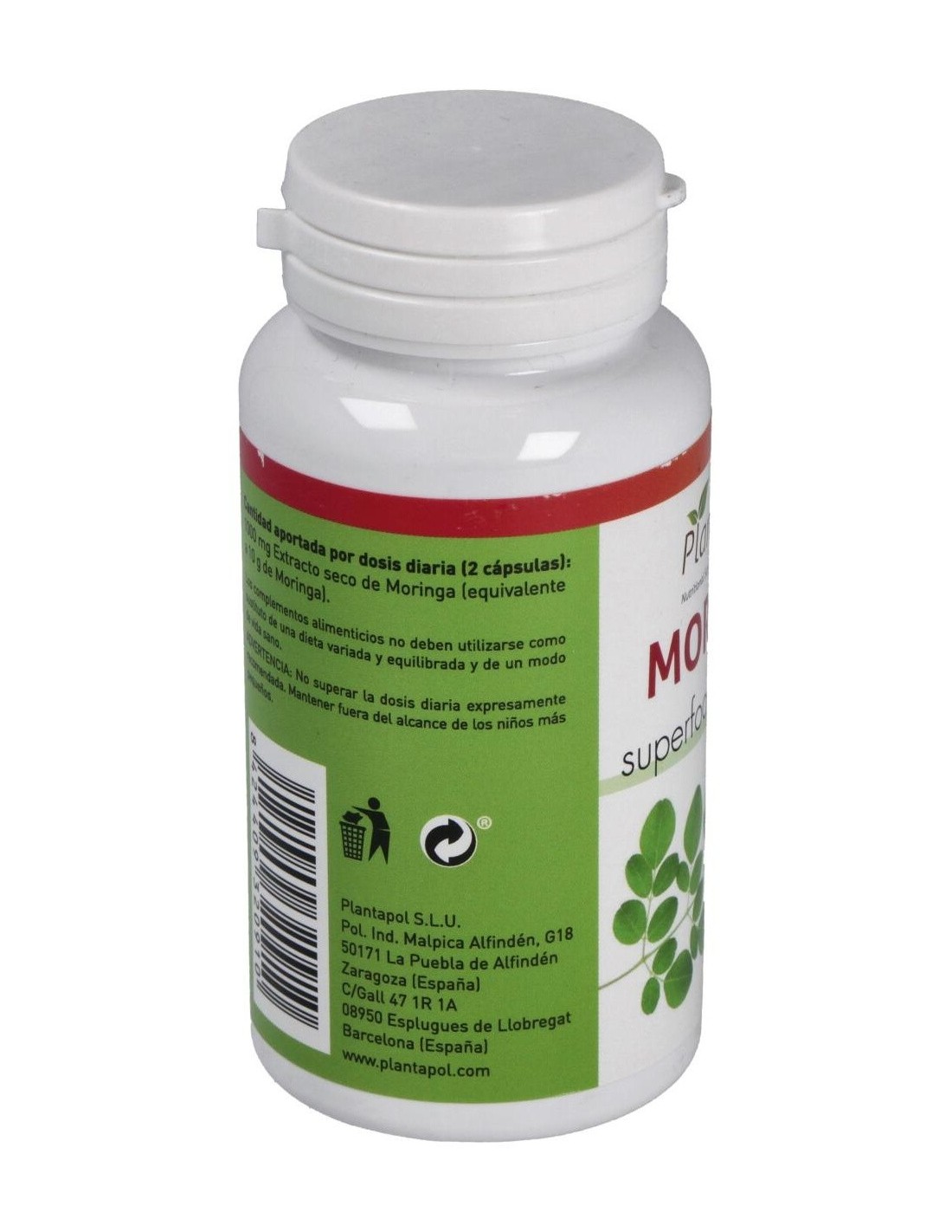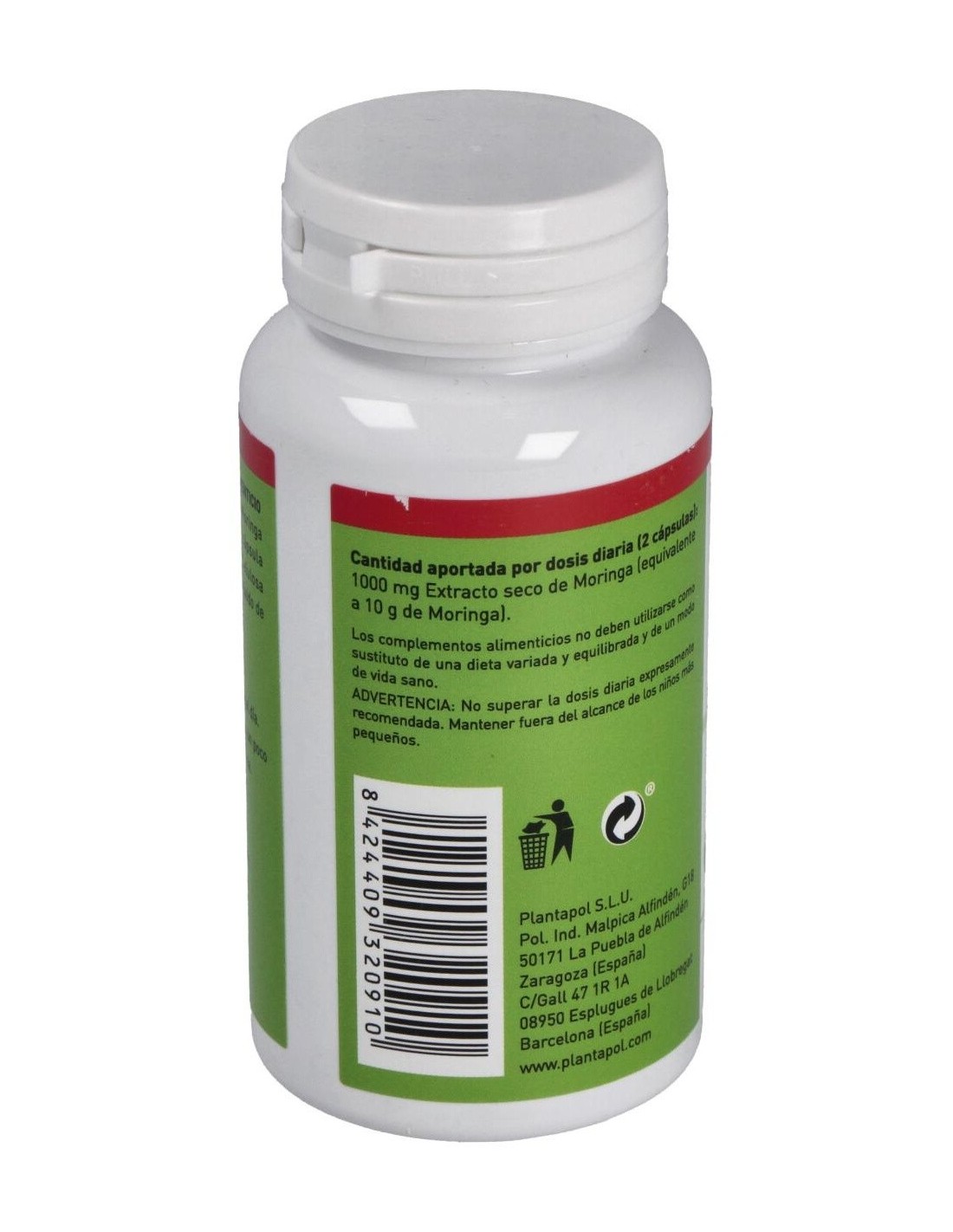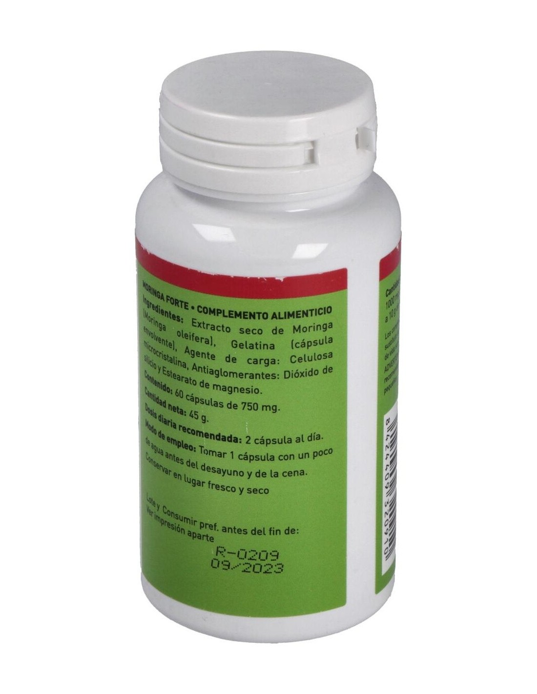 Extracto seco de Moringa (equivalente a 5 g de moringa por cápsula), gelatina, agente de carga: celulosa microcristalina, antiaglomerante: dióxido de silicio y estearato de magnesio.
