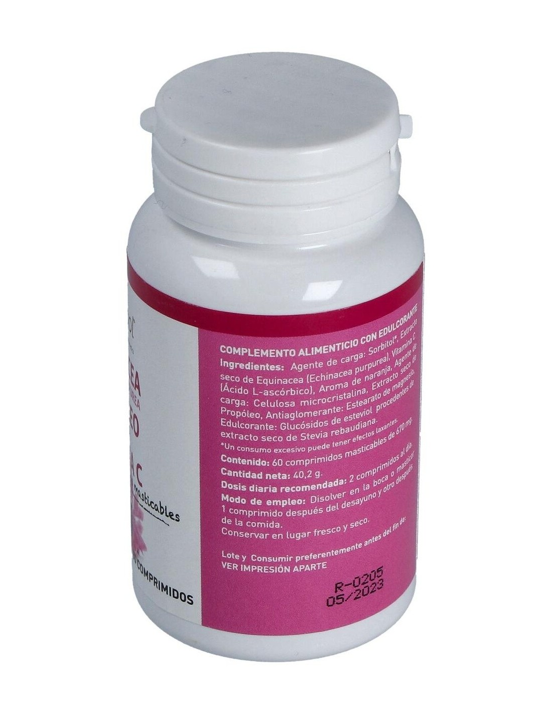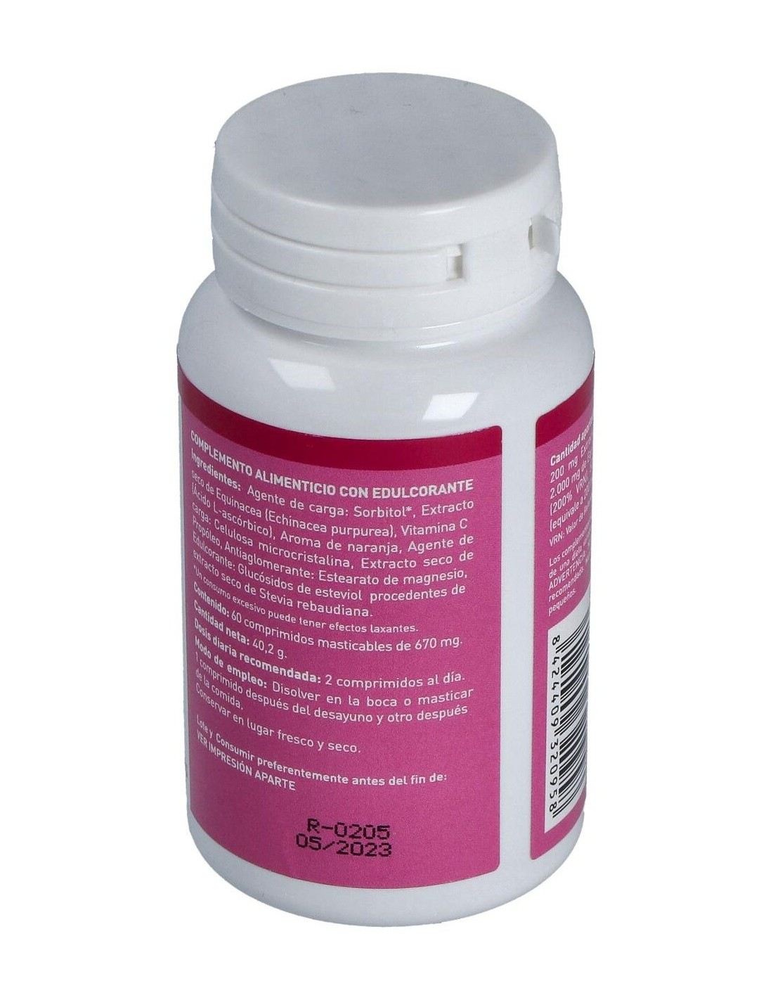 Complemento alimenticio de equinacea, propóleo y vitamina C, masticables que ayuda a las defensas. Posee una acción bactericida, antivírica y antiparásita demostrada, la equinacea estimula el sistema Inmunológico, la vitamina C tiene efecto antioxidante, cicatrizante y reparador de los tejidos.