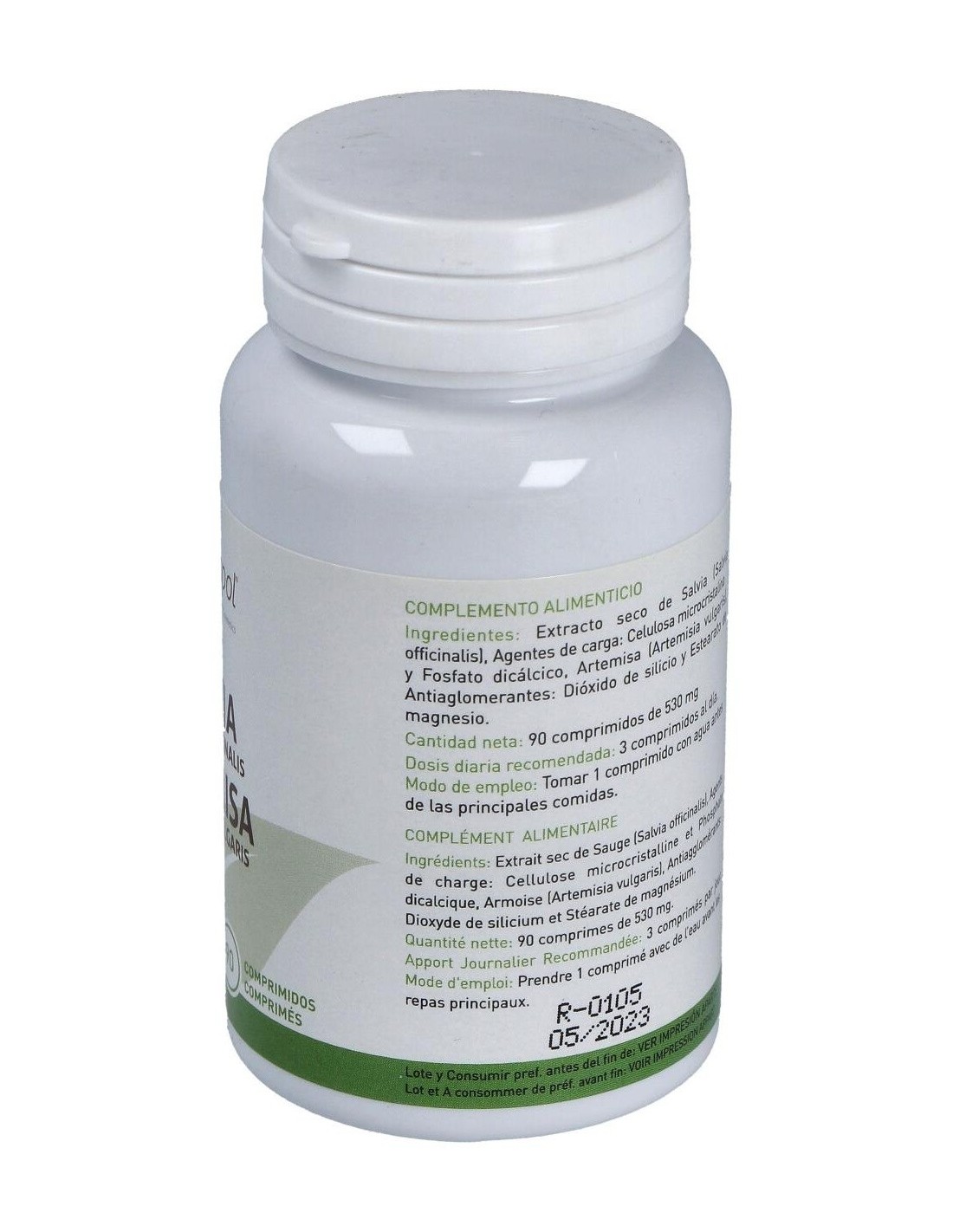 Extracto seco de Salvia (Salvia officinalis), Artemisa (Artemisia vulgaris), Agentes de carga: Celulosa microcristalina y Fosfato dicálcico, Antiaglomerantes: Dióxido de silicio y Estearato de magnesio.