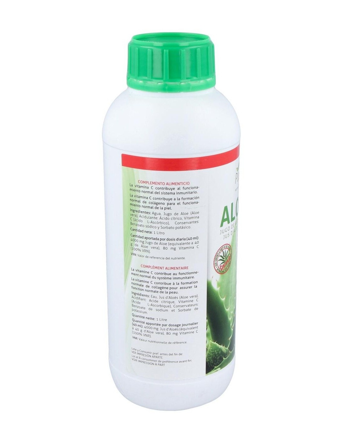 100% Jugo de Aloe Vera 994g, acidulante cítrico 2,5g, vitamina C 1,5g.