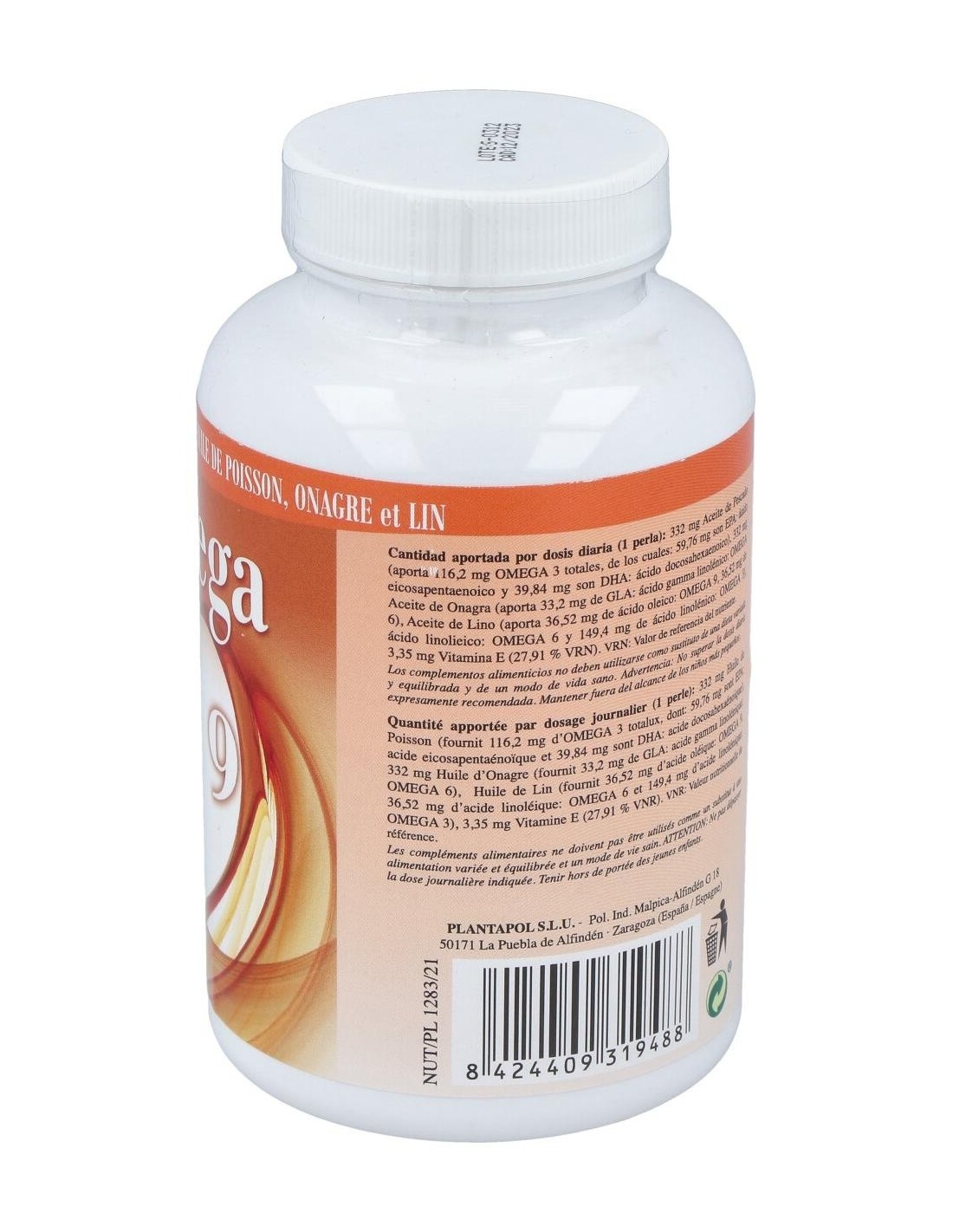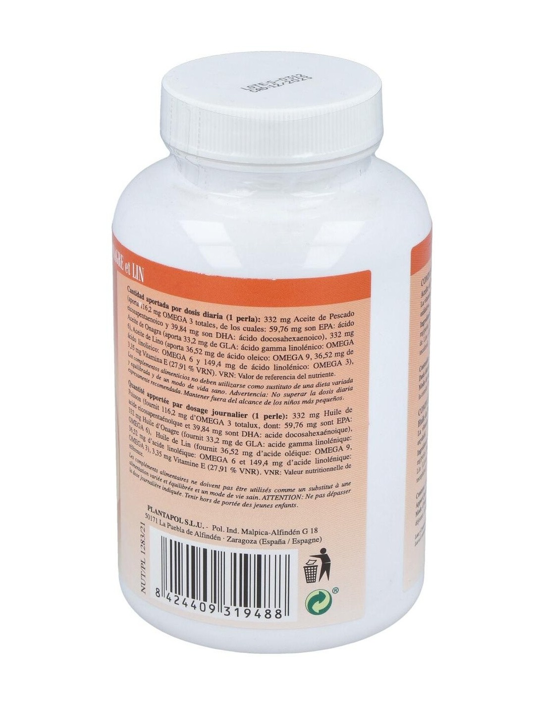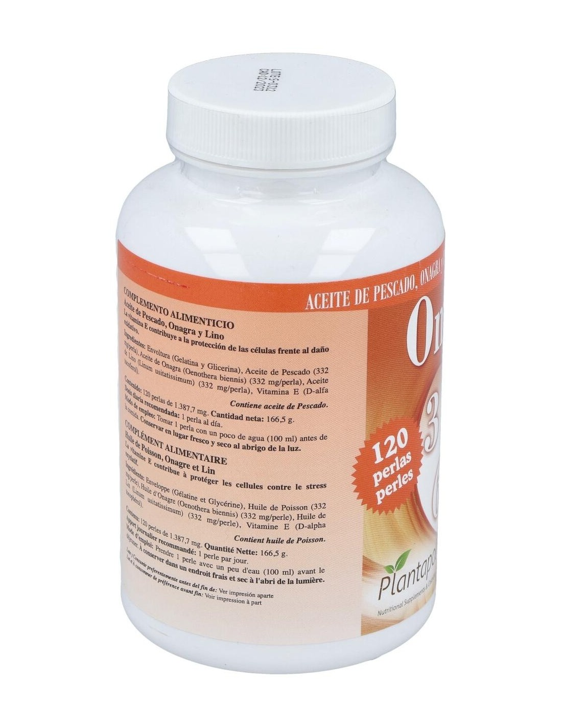Aceite de Pescado (aporta 116,2 mg omega 3 totales, de los cuales: 59,76 mg son EPA y 39,84 mg son DHA), Aceite de Onagra (aporta 33,2 mg de GLA: ácido gamma linolénico: omega 6), Aceite de Lino (aporta 36,52 mg de ácido oleico: omega 9, 36,52 mg de ácido linolieico: omega 6 y 149,4 mg de ácido linolénico: omega 3), Envoltura (gelatina y glicerol), Vitamina E.