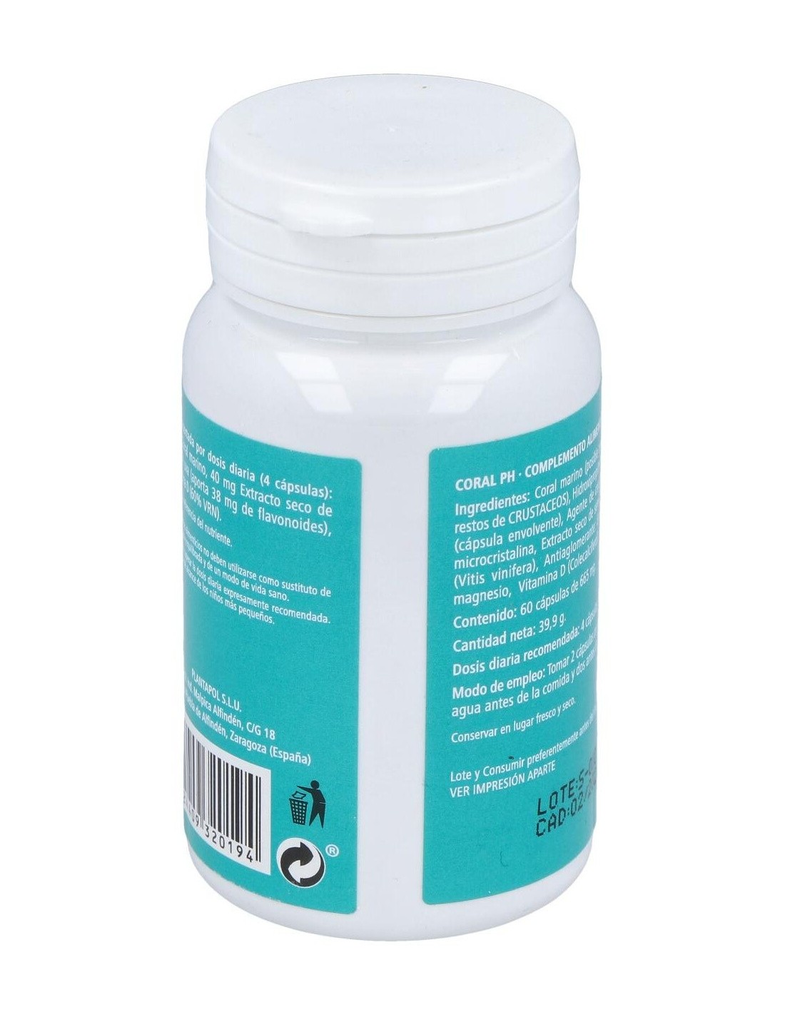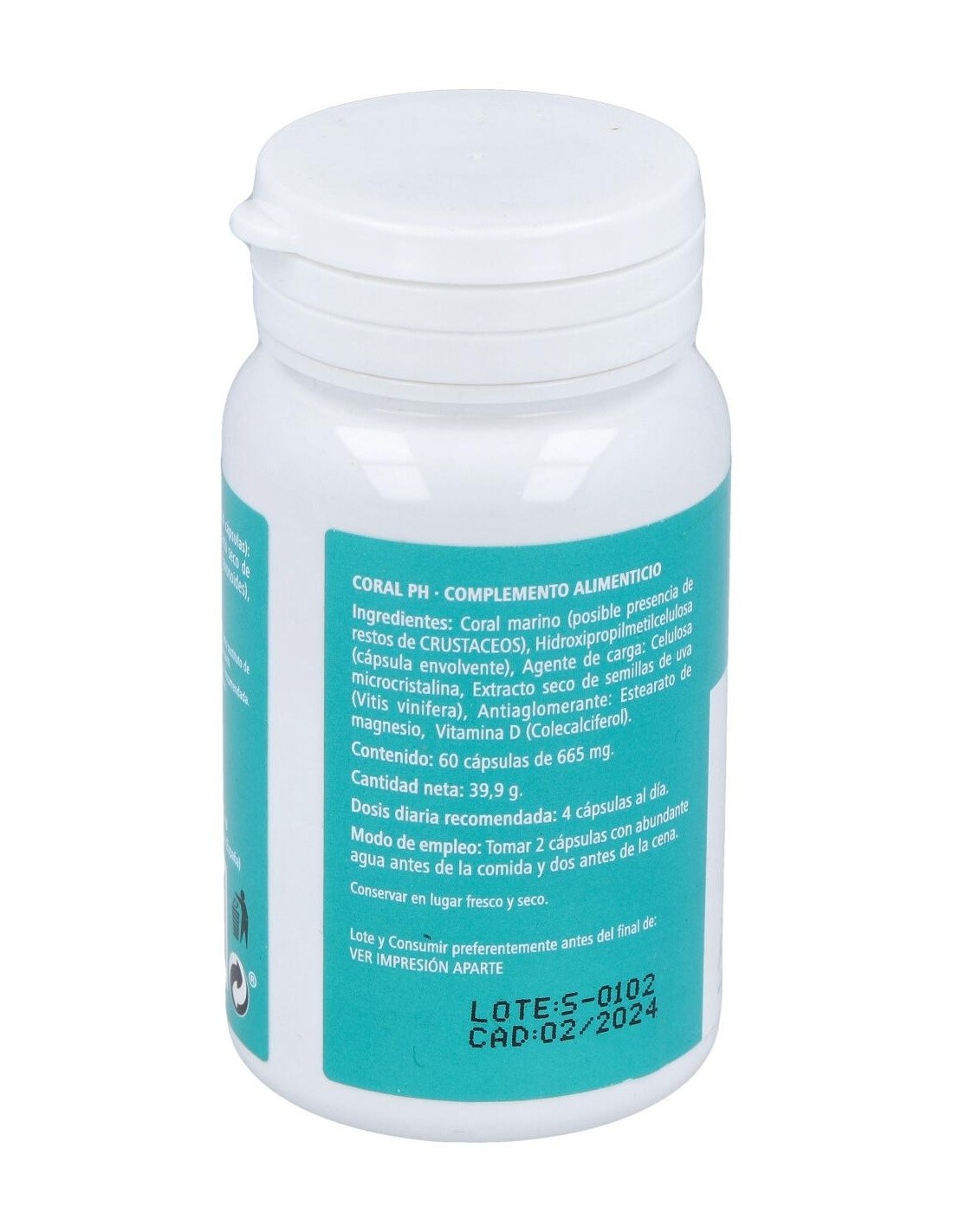 Coral marino, extracto de semilla de Uva, Vit D3. Antiaglomerante: estearato del magnesio Gelatina: cápsula vacía.