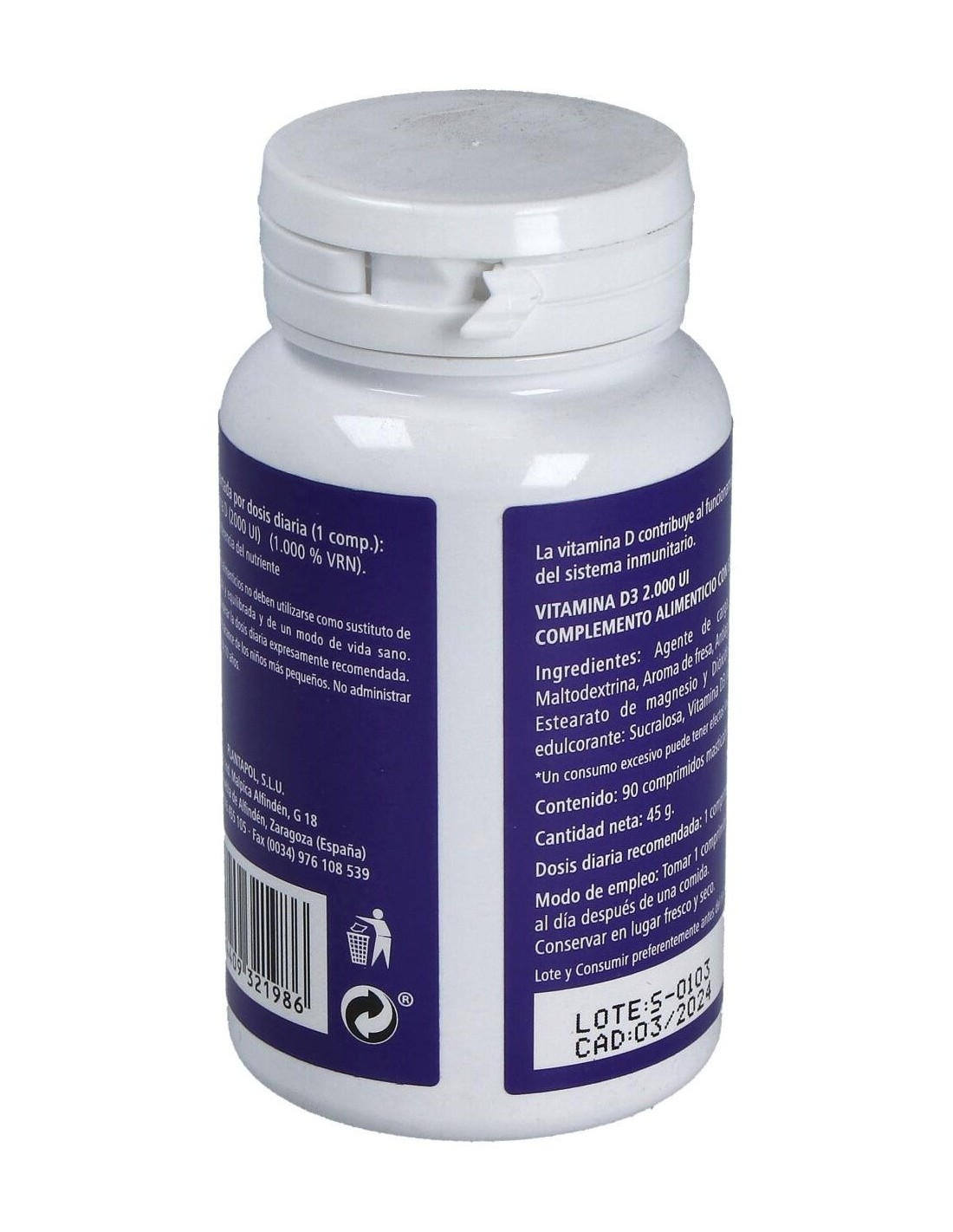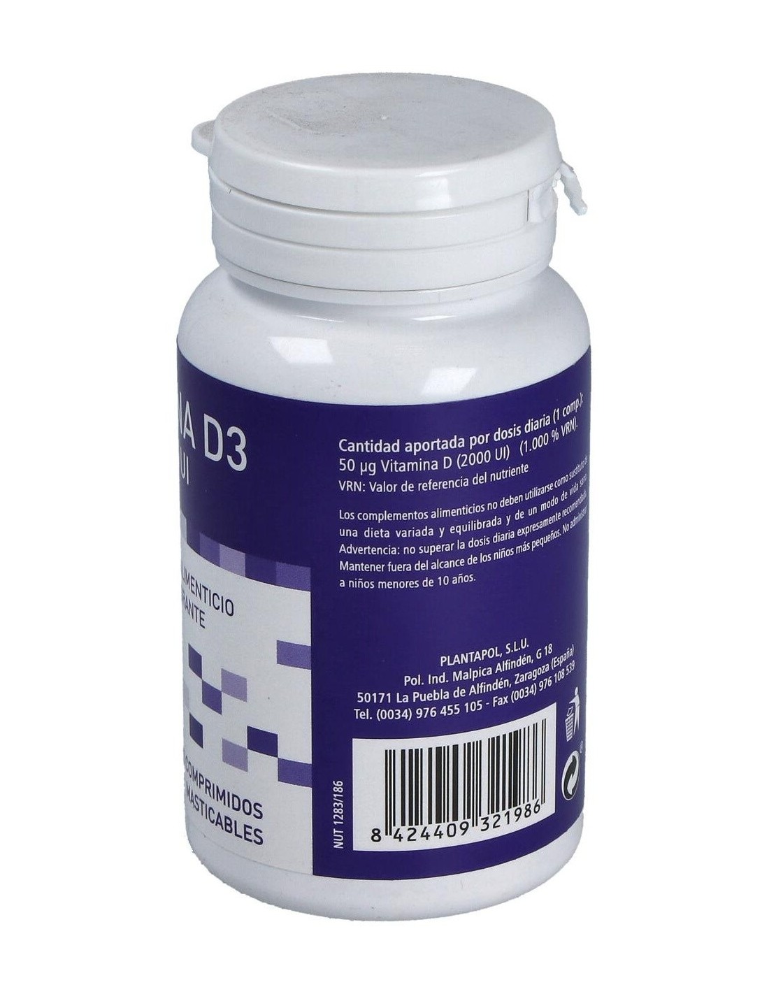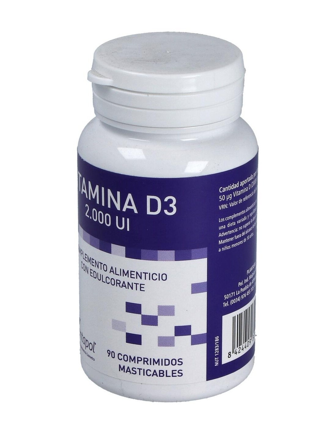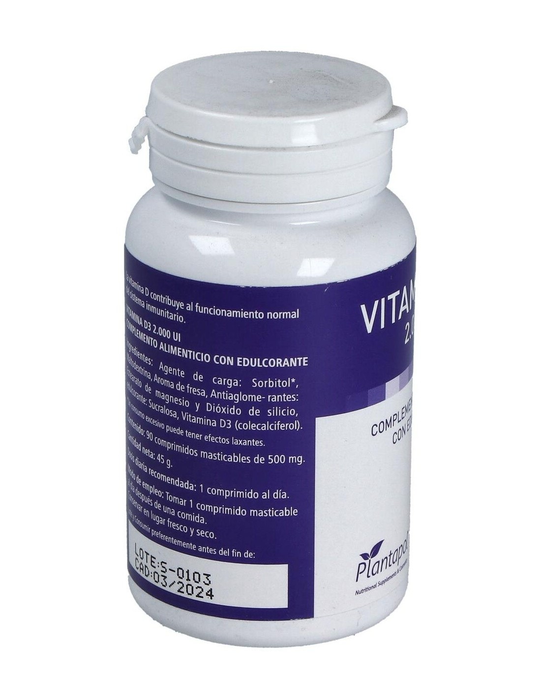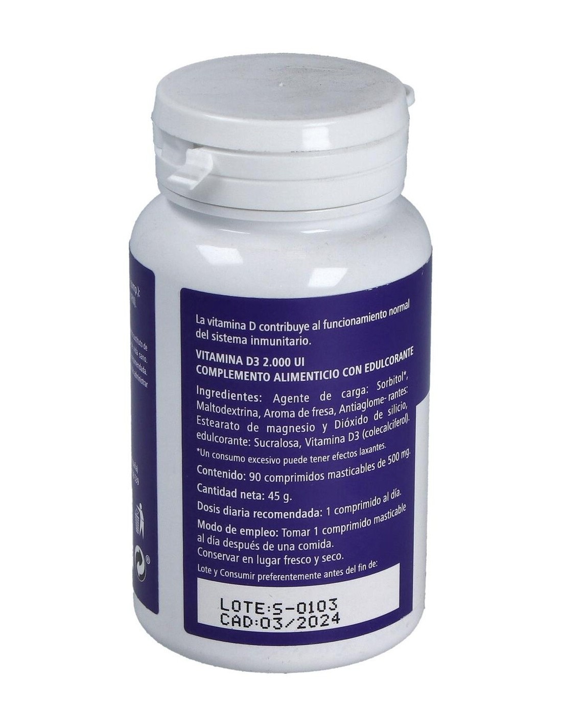 Complemento alimenticio en comprimidos masticables, endulzado con edulcorante, formulado a base de vitamina D3, que favorece el funcionamiento normal del sistema inmune. La vitamina D3 es reconocida por ayudar a prevenir enfermedades metabólicas y por favorecer la absorción intestinal del calcio y del fósforo, vitales para la formación adecuada de los huesos. Conservar en un lugar fresco, seco y a temperatura ambiente.