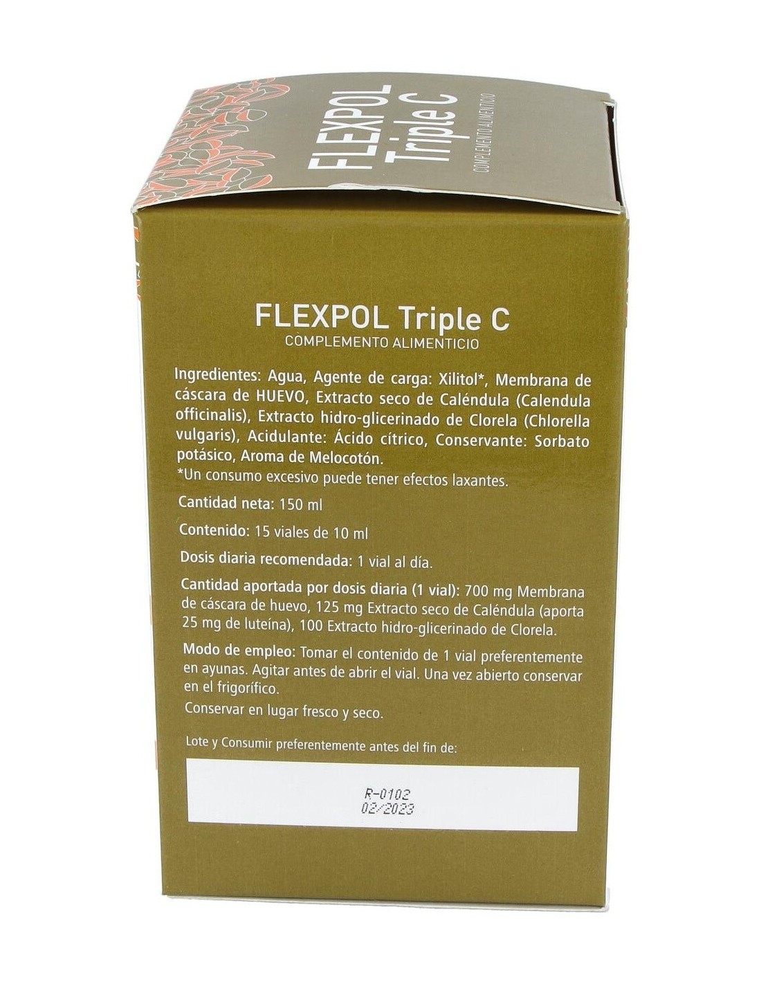 Membrana de cáscara de huevo, extracto seco de Calendula officinalis, extracto hidroglicerinado de Chlorella vulgaris Agua, acidulante: ácido cítrico. Agente de carga: Xilitol (obtenido de la corteza de arce), Conservante: sorbato potásico. Aroma de melocotón.