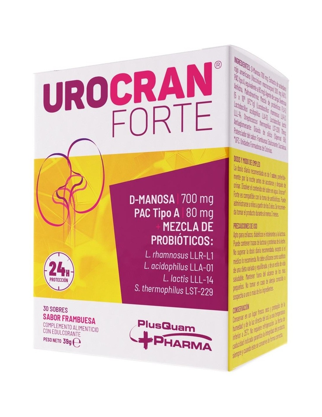 PLUSQUAMContiene una combinación única de tres ingredientes: D-Manosa + PAC Tipo A (Arándano rojo) + Probióticos, que contribuyen al normal funcionamiento del tracto urinario, así como del sistema excretor e inmunitario. Gracias a la proporción adecuada y en equilibrio de sus ingredientes, Urocran® Forte puede tomarse en periodos de larga duración. Es compatible con la toma de antibióticos, puede administrarse a niños a partir de 3 años, es apto para embarazadas y compatible con la lactancia. Sabor a frambuesa.