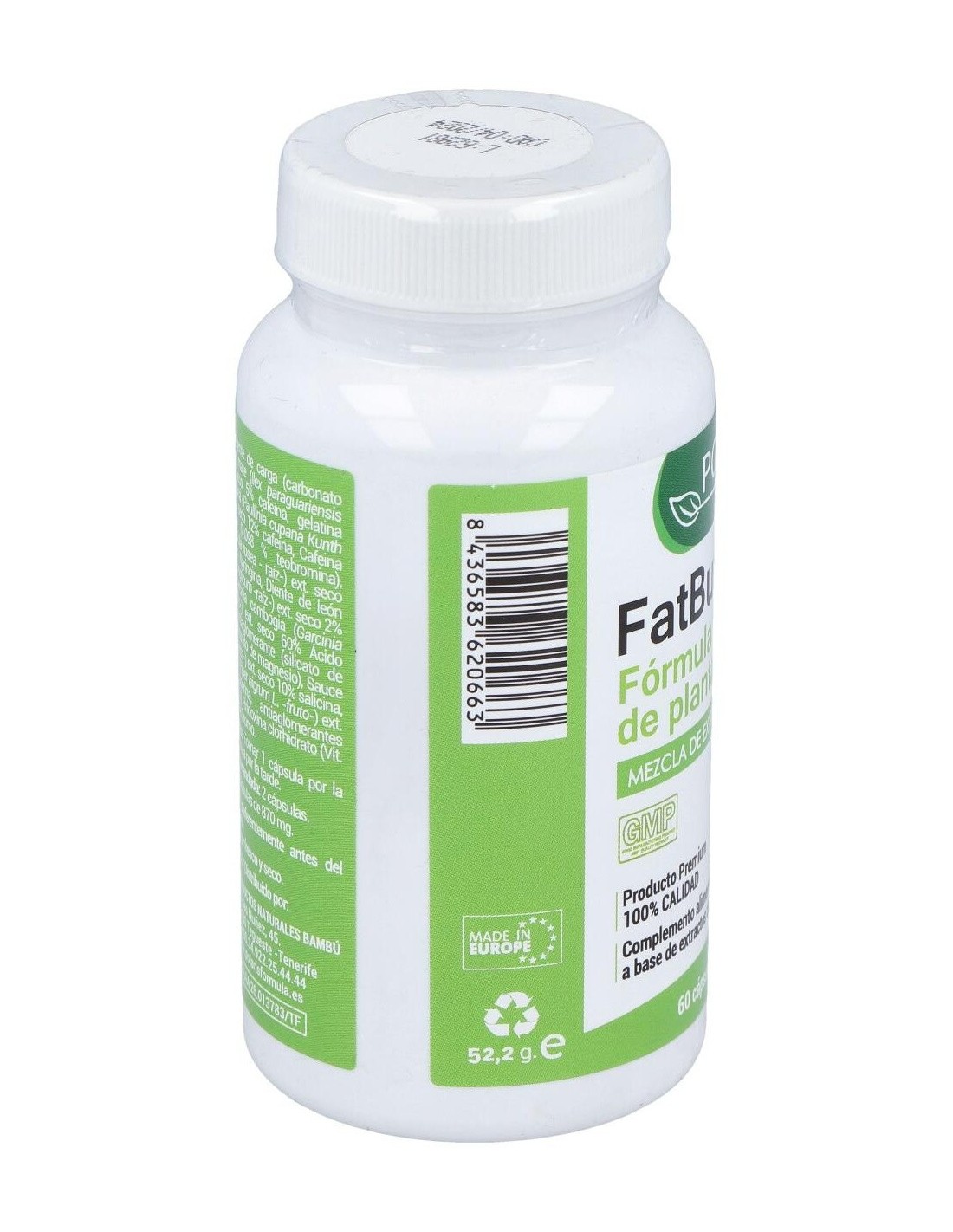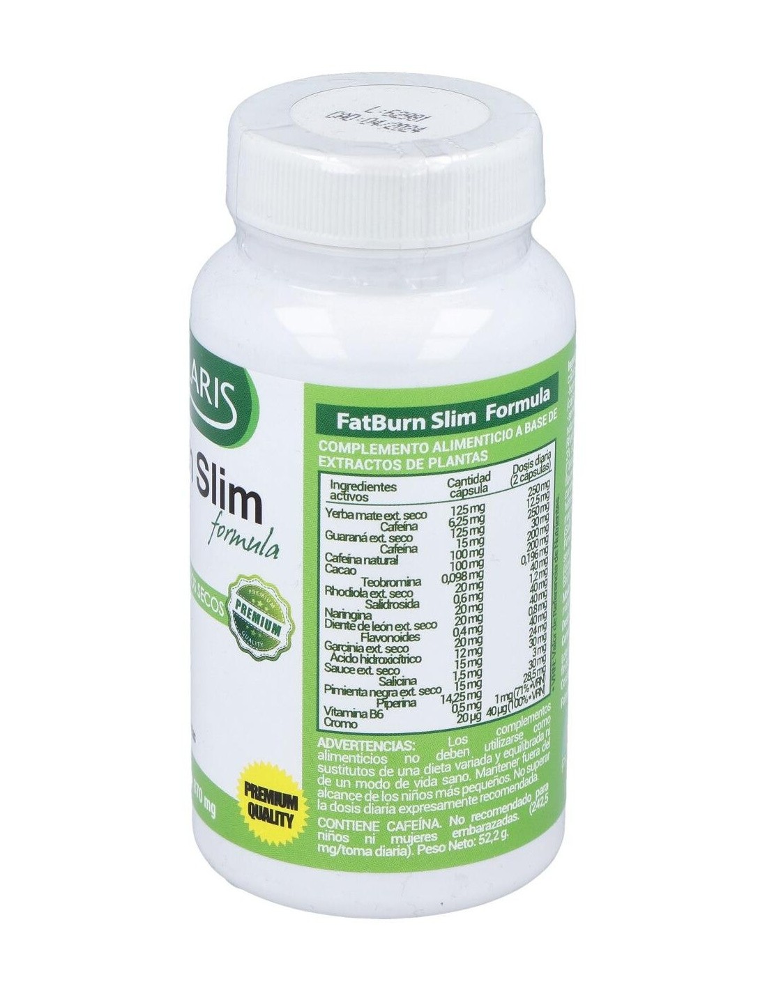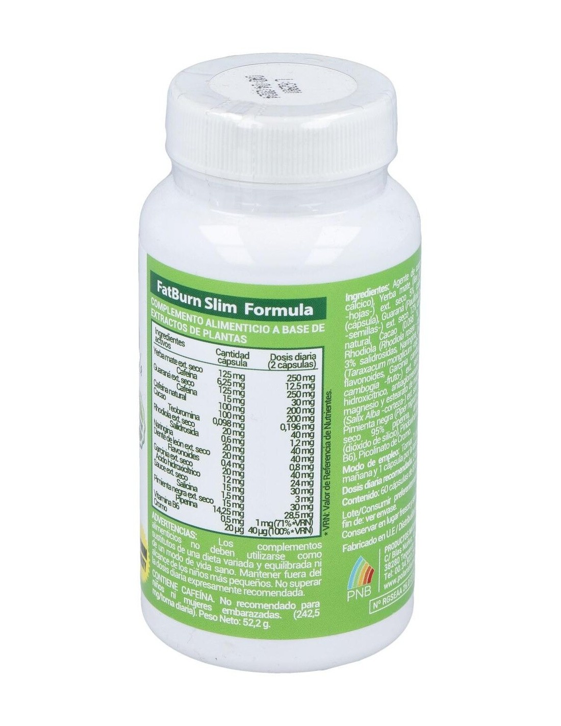 Yerba mate (Ilex paraguariensis hojas-) ext. seco 5% cafeína, Gelatina (cápsula), Guaraná (Paullinia cupana Kunth semillas-) ext. seco 12% cafeína, Cafeina natural, Cacao (0.098 % teobromina), Rodiola (Rhodiola rosea raíz-) ext. seco 3% salidrosidas, Naringina, Diente de león (Taraxacum monglicum -raíz-) ext. seco 2% flavonoides, Garcinia cambogia (Garcinia cambogia fruto-) ext. seco 60% Ácido hidroxicítrico, Sauce (Salix Alba corteza-) ext. seco 10% salicina, Pimienta negra (Piper nigrumL fruto -) ext. seco 95% piperina, Vitamina B6,Picolinato de cromo