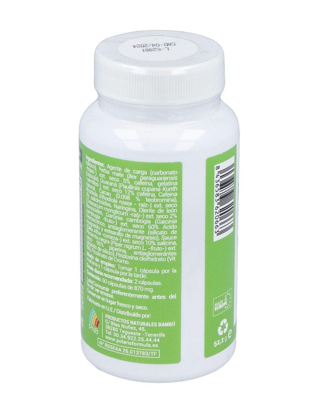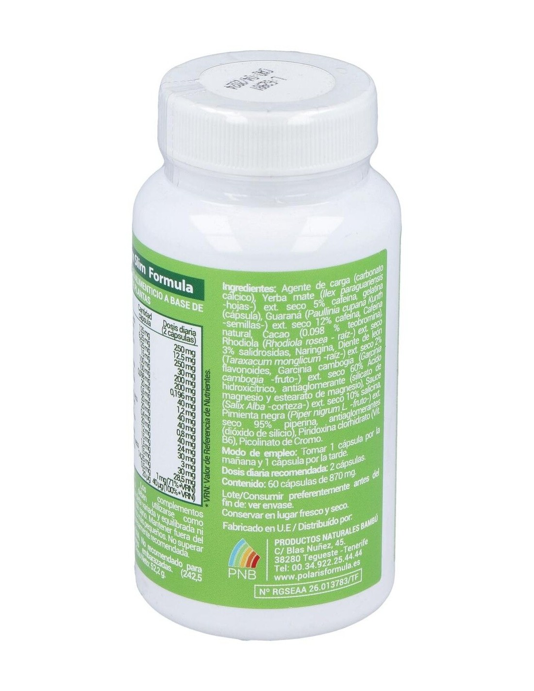 Complemento alimenticio en formato de cápsulas de gelatina que está especialmente ideado para ayudar a mantener un peso saludable, gracias a su compuesto elaborado a base de una fórmula especial de plantas y de extractos secos, como la yerba mate, cafeína y guaraná. Gracias a su compuesto a base de extractos de plantas con acción quema grasas, es ideal para combinar con una dieta sana y saludable.