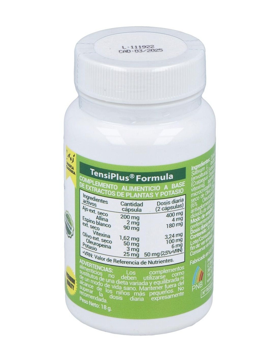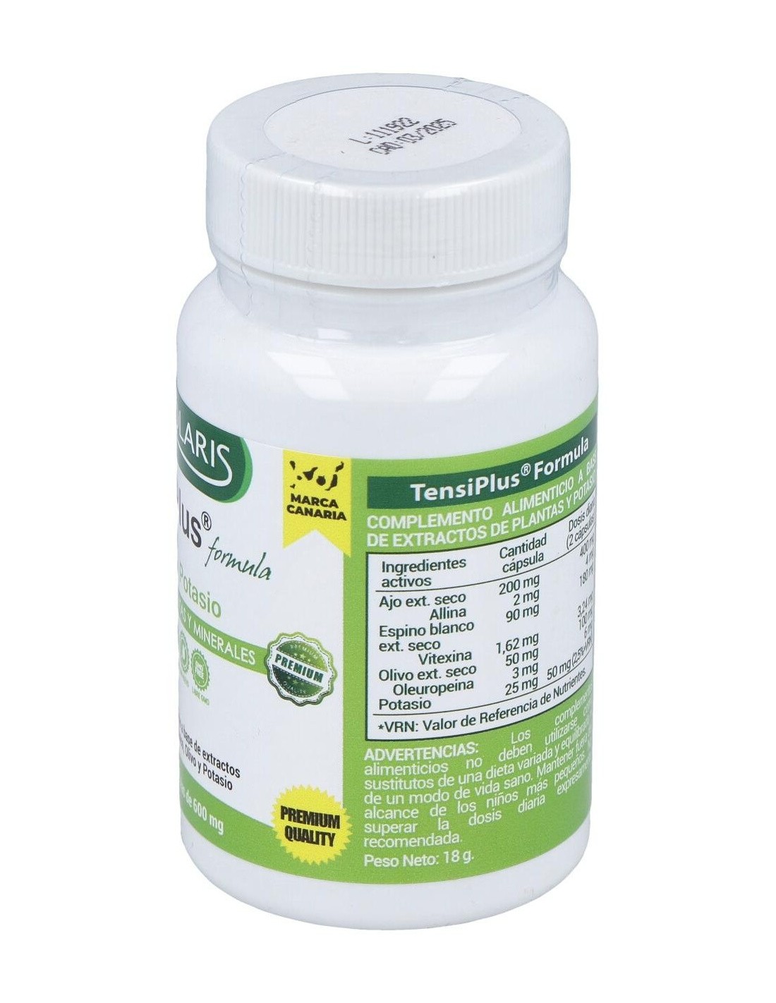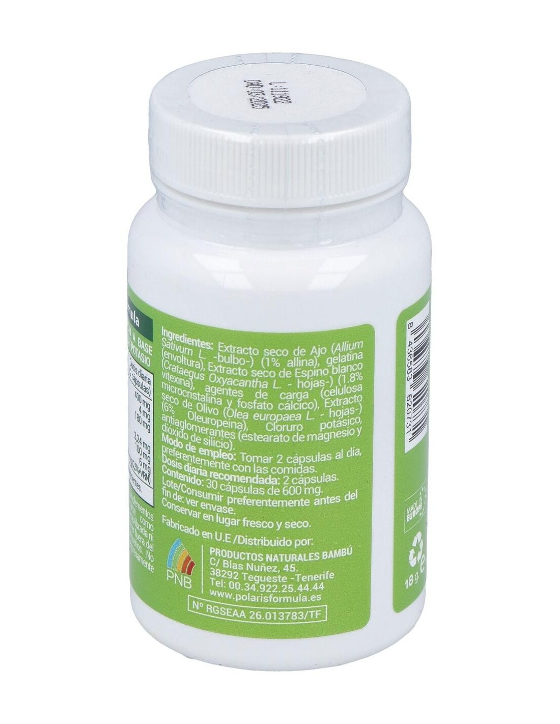 Extracto seco de ajo (allium Sativum L -bulbo-)(1% allina), Gelatina (envoltura), Extracto seco de espino blanco (crataegus Oxyacantha L hojas-)(1,8% vitexina), Agentes de carga (celulosa microcristalina y fosfato cálcico), Extracto seco de olivo (olea europaea L hojas-)(6% Oleuropeina), Cloruro potásico, Antiaglomerantes (estearato de magnesio y dióxido de silicio).