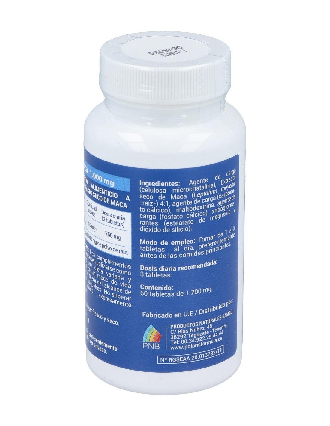 Agente De Carga (Celulosa Microcristalina), Extracto Seco De Maca (Lepidium Meyenii, -Raíz-) 4:1, Agente De Carga (Carbonato Cálcico), Maltodextrina, Agente De Carga (Fosfato Cálcico), Antiaglomerantes (Estearato De Magnesio y Dióxido De Silicio).