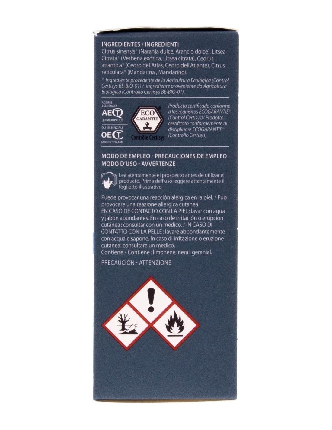 100% aceites esenciales ecológicos* : Naranja dulce, Verbena exótica, Cedro del Atlas, Mandarín*.