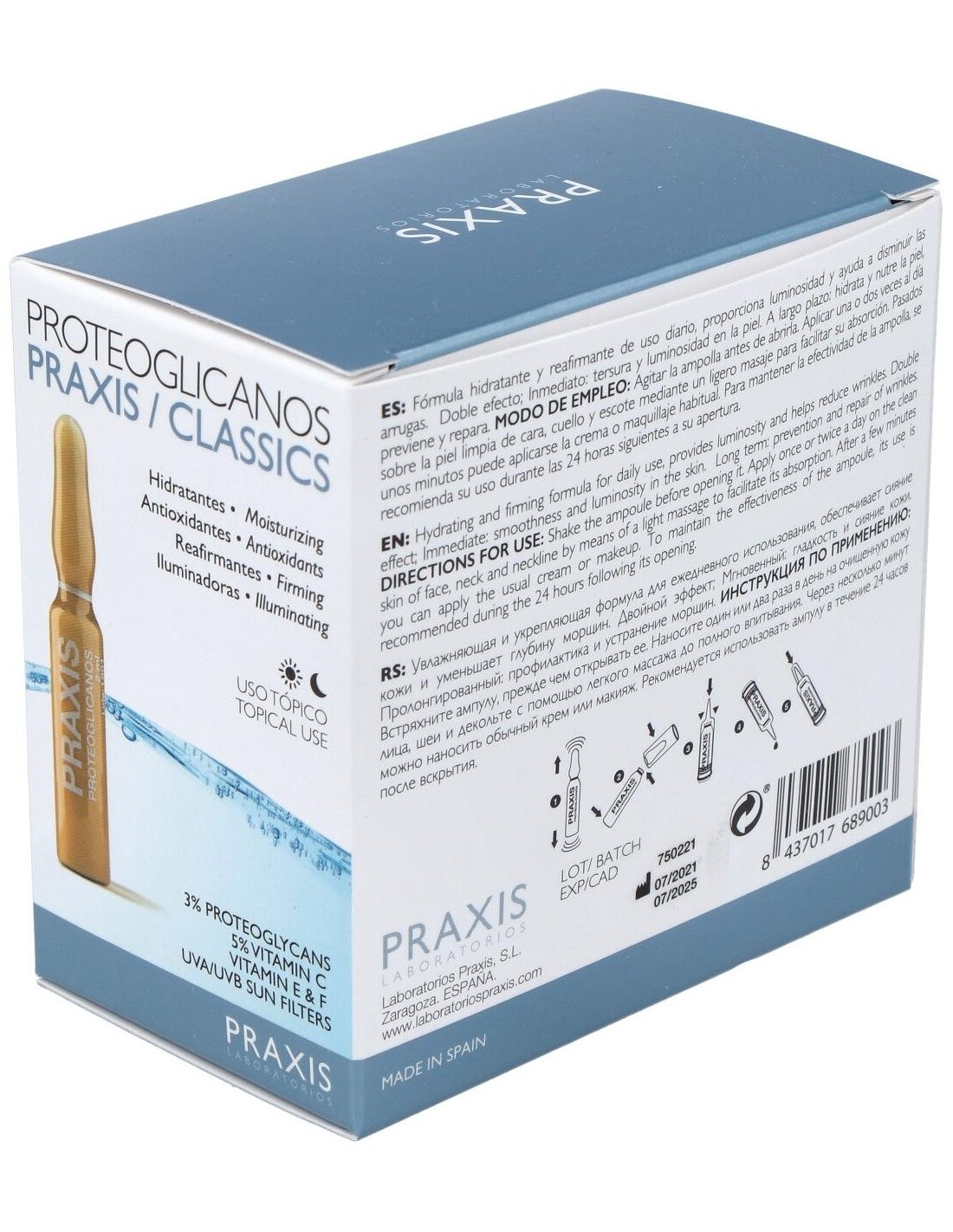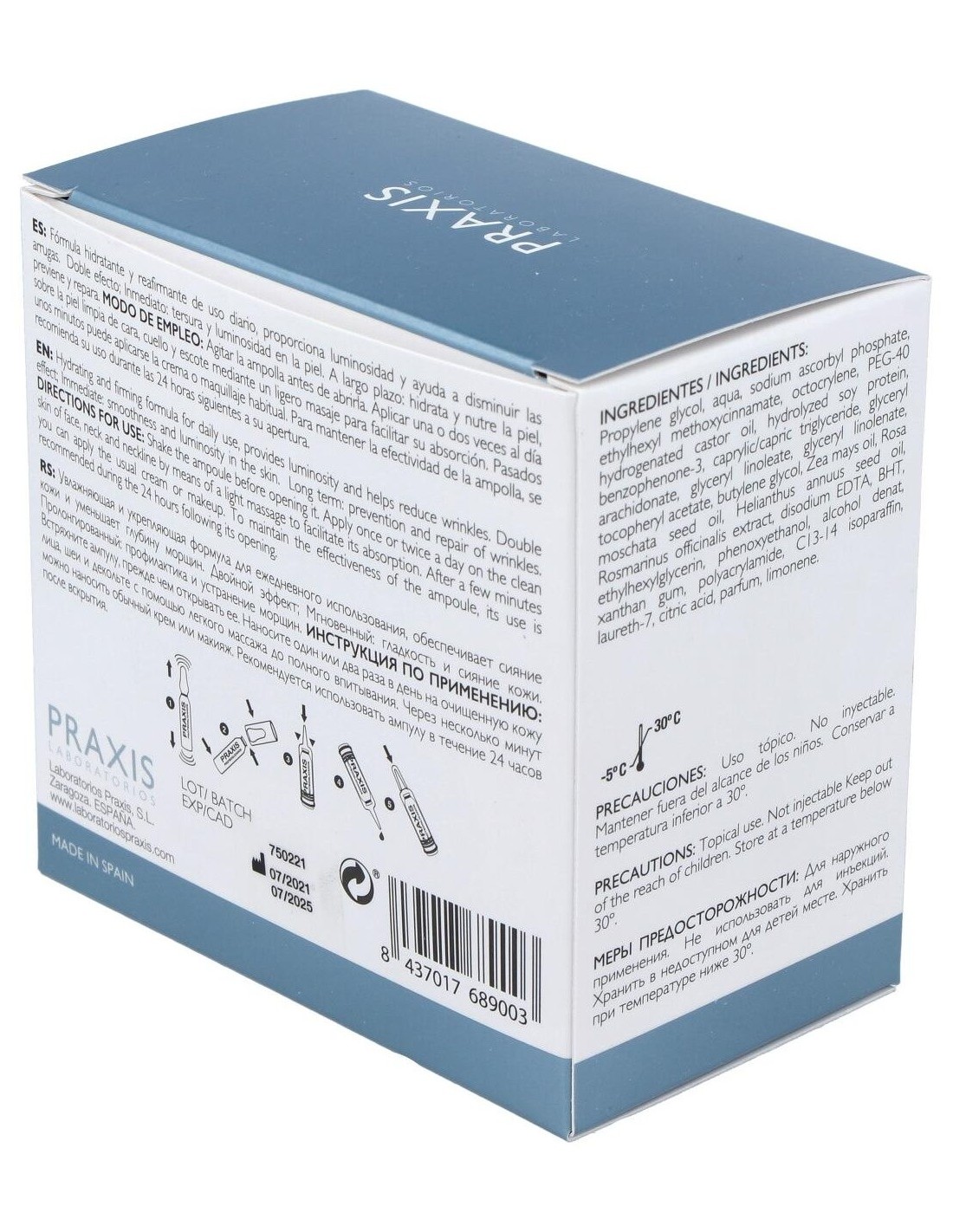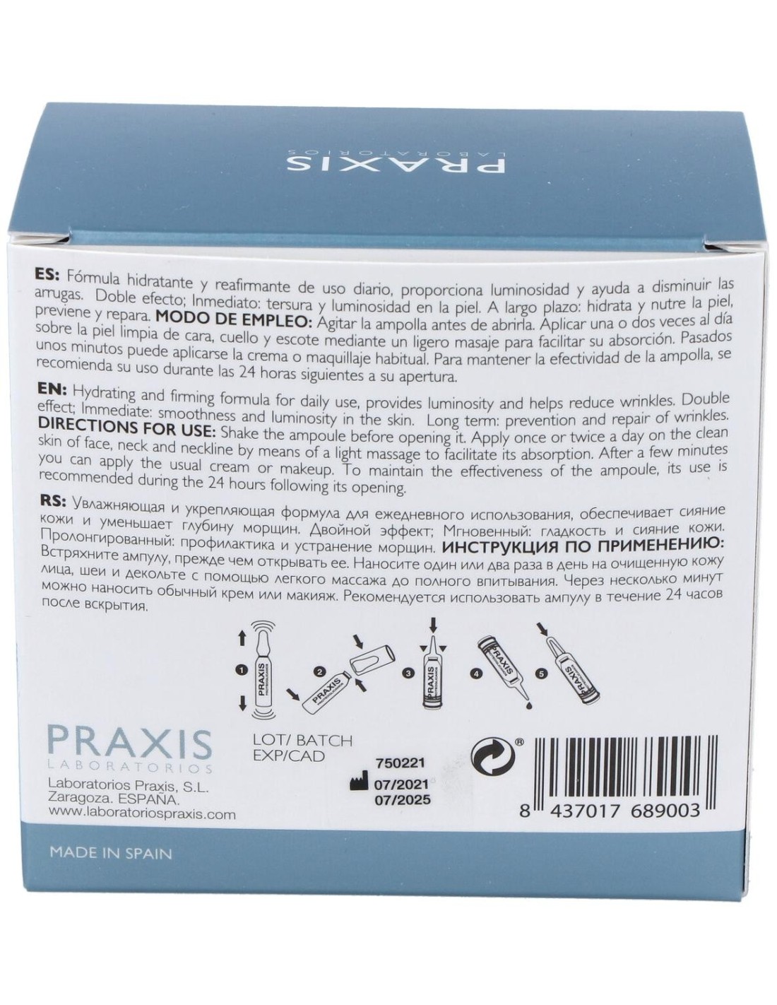 Girar la ampolla antes de abrir. Aplicar el producto sobre la piel limpia de cara, cuello y escote mediante un ligero masaje para facilitar su absorción. Transcurridos 5 minutos aplicar la crema o maquillaje habitual.