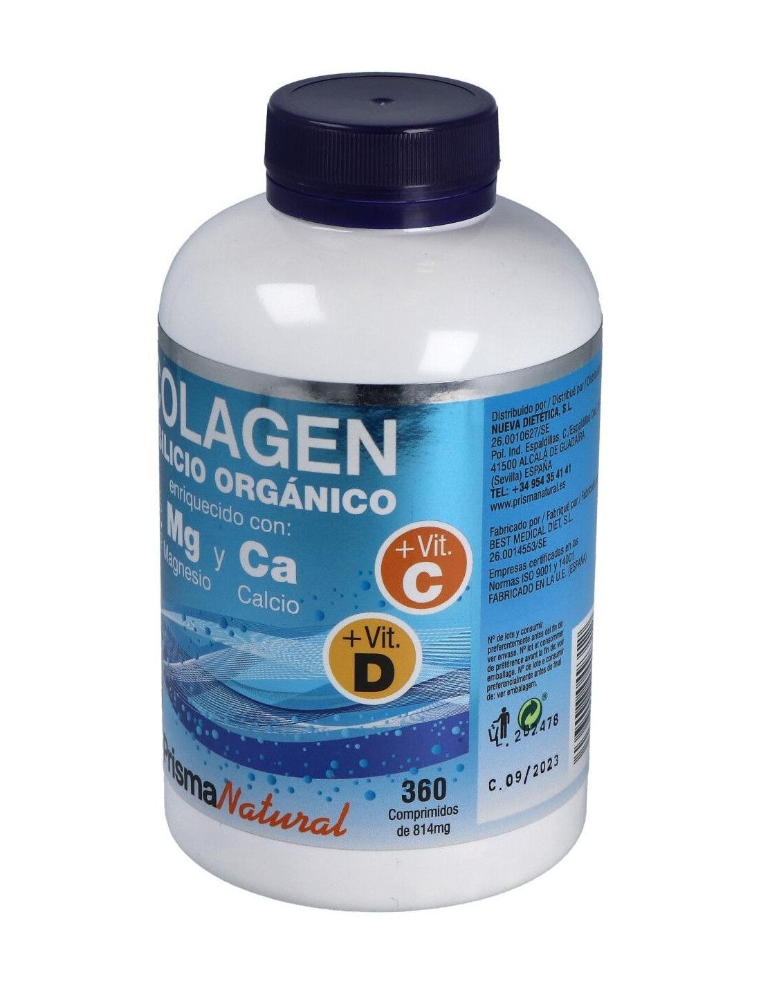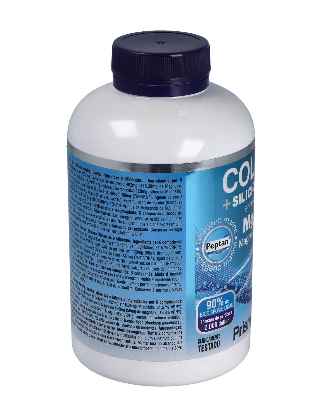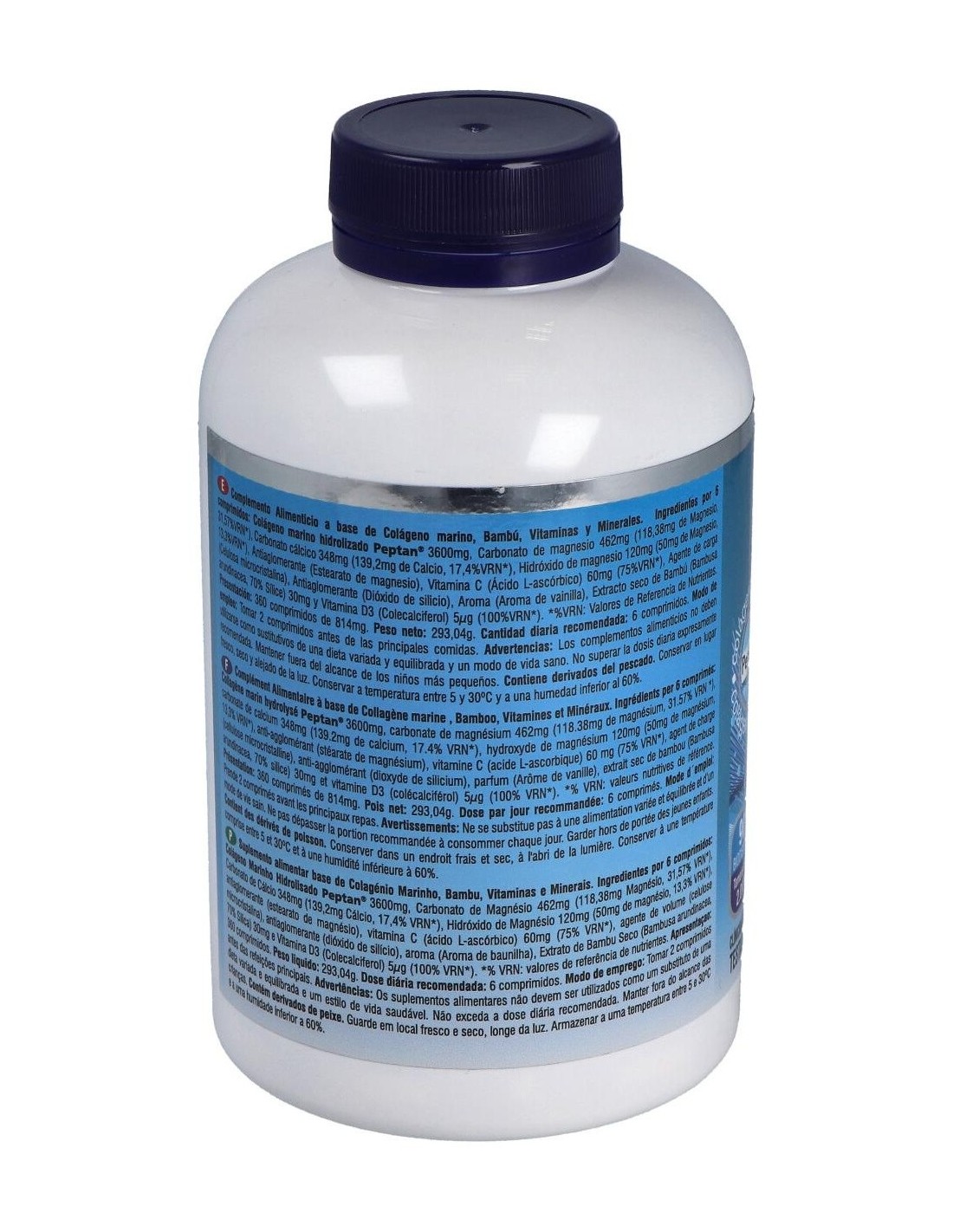 Colágeno marino hidrolizado 3600 mg, Carbonato de magnesio 462 mg (118,38 mg de Magnesio), Carbonato cálcico 348 mg (139,2 mg de Calcio), Hidróxido de magnesio 120 mg (72 mg de Magnesio), Agente de carga (Celulosa microcristalina), Antiaglomerantes (Estearato de magnesio y Dióxido de silicio), Vitamina C (Ácido l-ascórbico) 60 mg, Bambú (Bambusa arundinacea Retz (Willd.), 70% Silicio) 30 mg y Vitamina D (Colecalciferol) 5 µg.