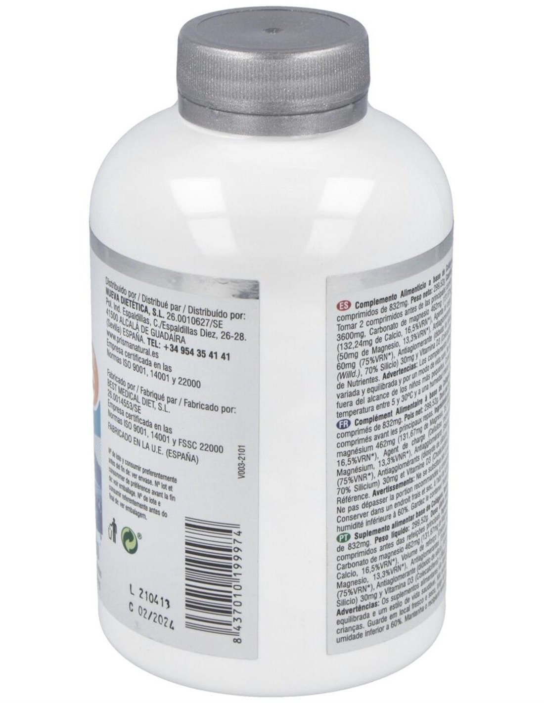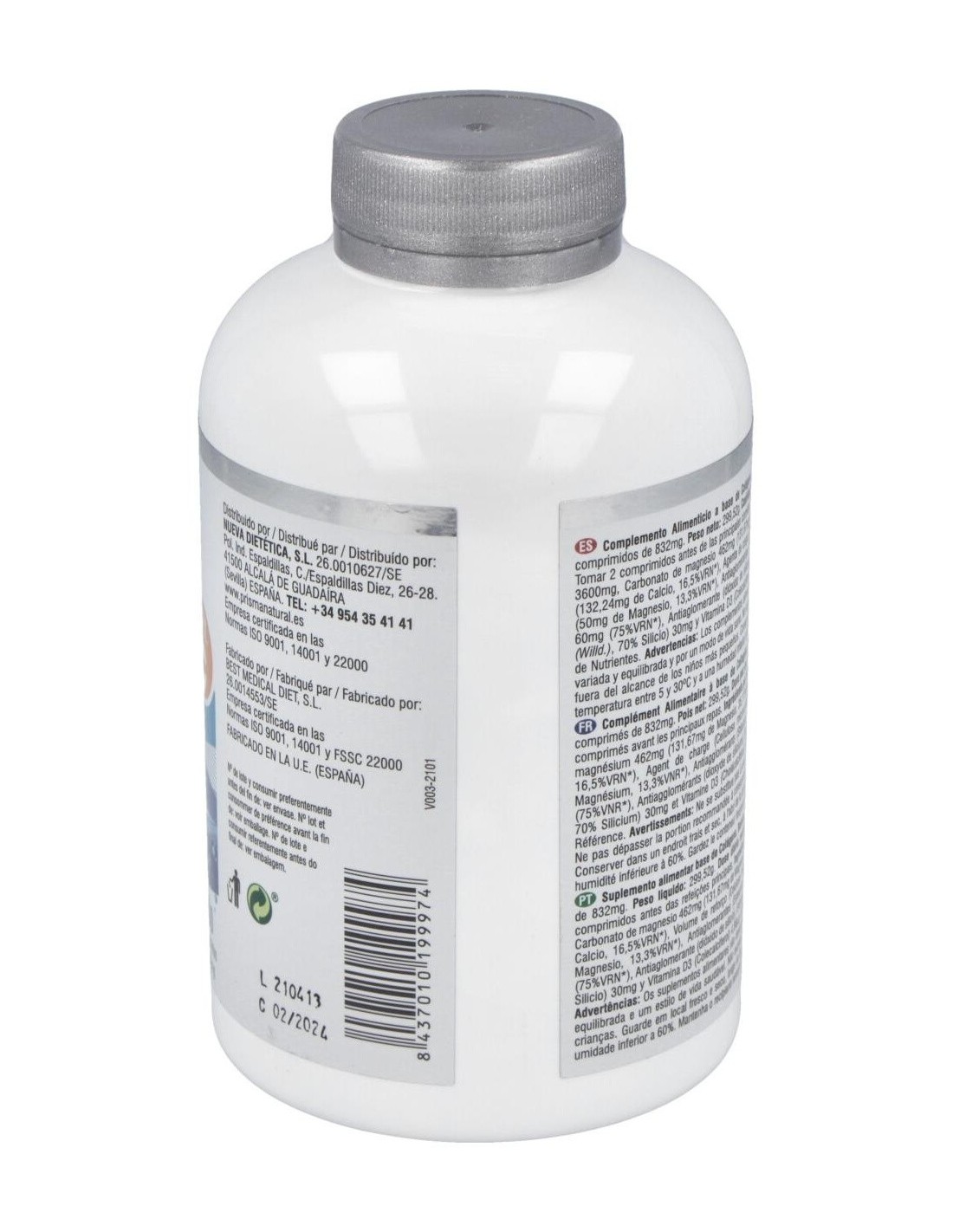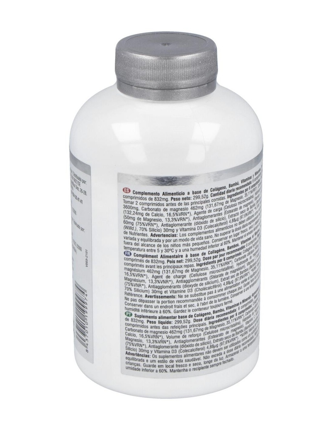 Ingredientes por 6 comprimidos: Colágeno marino hidrolizado 3600mg, Carbonato de magnesio 462mg (118,38mg de Magnesio, 31,57%VRN), Carbonato cálcico 348mg (139,2mg de Calcio, 17,4%VRN), Hidróxido de magnesio 120mg (72mg de Magnesio, 19,2%VRN), Agente de carga (Celulosa microcristalina), Antiaglomerantes (Estearato de magnesio y Dióxido de silicio), Vitamina C (Ácido l-ascórbico) 60mg (75%VRN), Bambú (Bambusa arundinacea Retz (Willd.), 70% Silicio) 30mg y Vitamina D (Colecalciferol) 5µg (100%VRN).