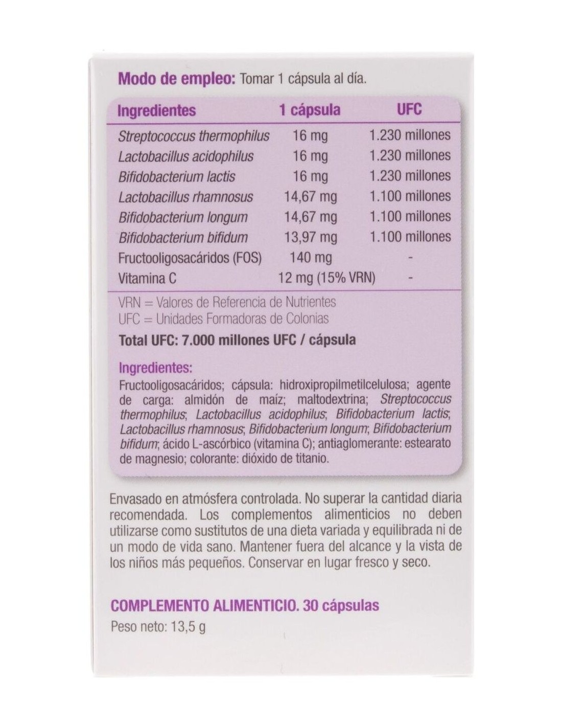 Streptococcus thermophilus, Lactobacillus acidophilus, Bifidobacterium lactis, Lactobacillus rhamnosus, Bifidobacterium longum, Bifidobacterium bifidum, Fructooligosacáridos (FOS), Vitamina C