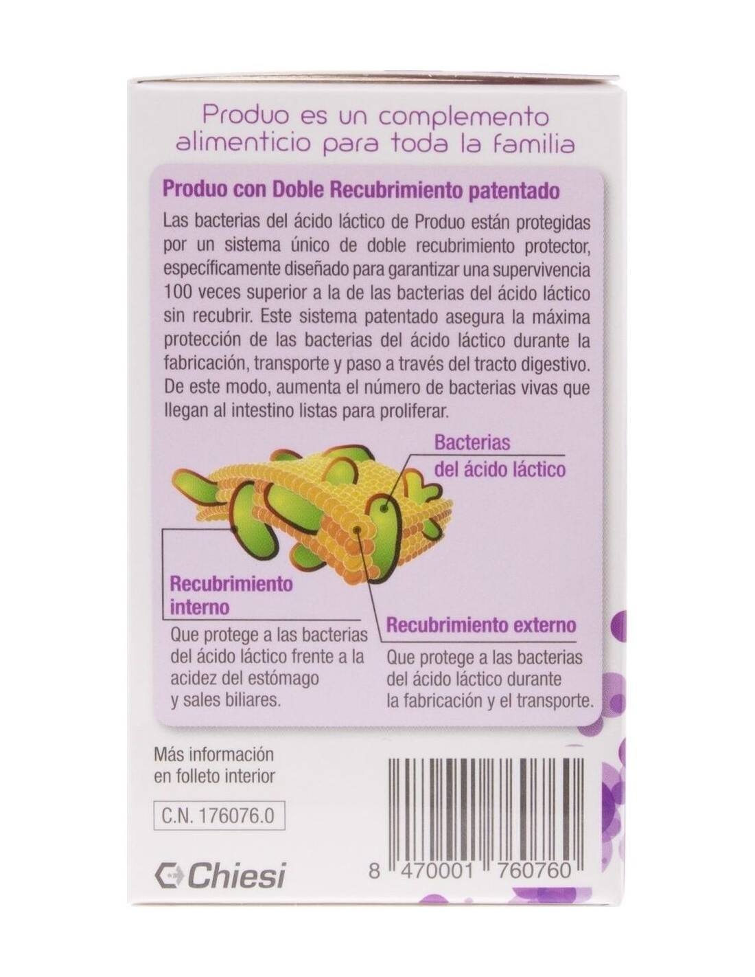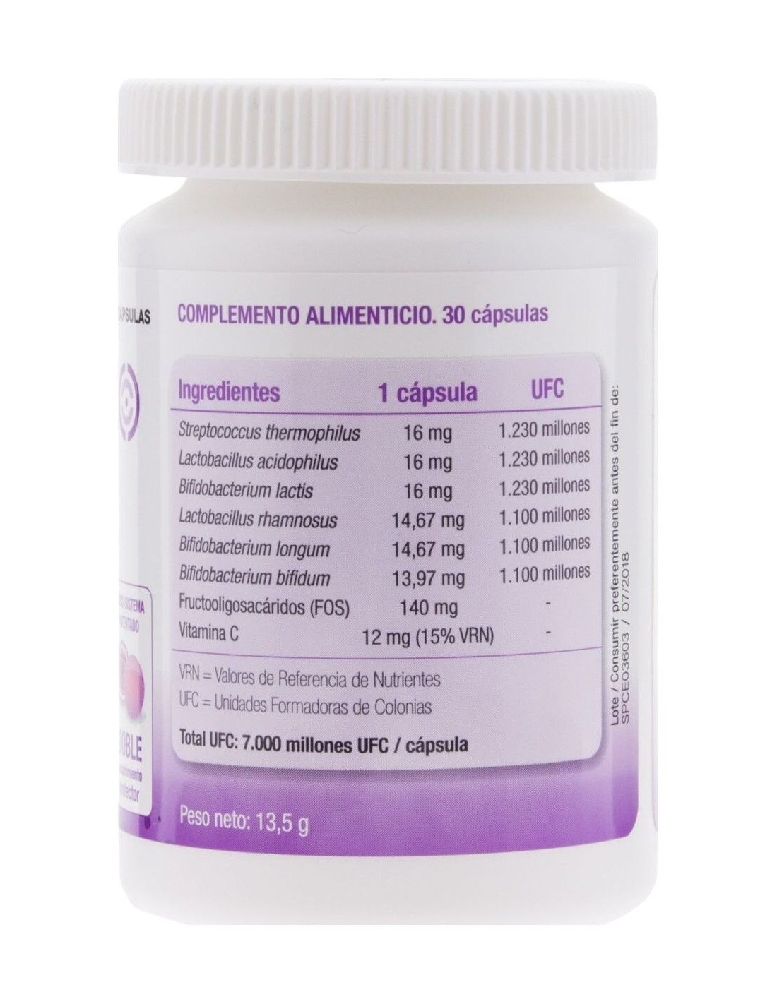 Complemento alimenticio a base de microorganismos, Lactobacilos y Bifidobacterias, que ayudan a mantener el equilibrio de la flora intestinal. Por su tecnología patentada de doble recubrimiento protector, garantiza una supervivencia 100 veces superior a la de los microorganismos sin recubrir, incrementando el número de ellos que llegan al intestino. Además vitamina C que contribuye a la función normal del sistema inmune.