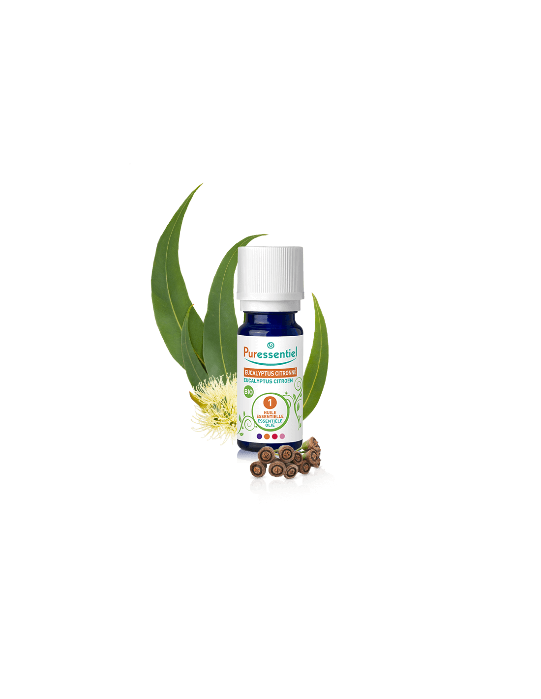 PURESSENTIELAceite esencial AEBBD (Aceite Esencial Botánica y bioquímicamente Definido). De color amarillo pálido, el aceite esencial de eucalipto limón tiene un fuerte olor a limón debido a sus hojas.