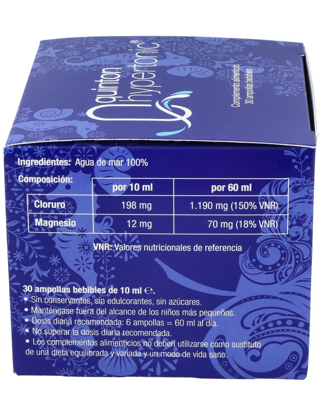 Agua de mar oceánica total, preparada según las indicaciones del fisiólogo y biólogo René Quinton. Por su contenido en magnesio ayuda al equilibrio electrolítico, al metabolismo energético normal y a disminuir el cansancio y la fatiga. Contribuye al funcionamiento normal del sistema nervioso y de la función psicológica. Ayuda al funcionamiento normal de los músculos y al mantenimiento de los huesos y dientes en condiciones normales.