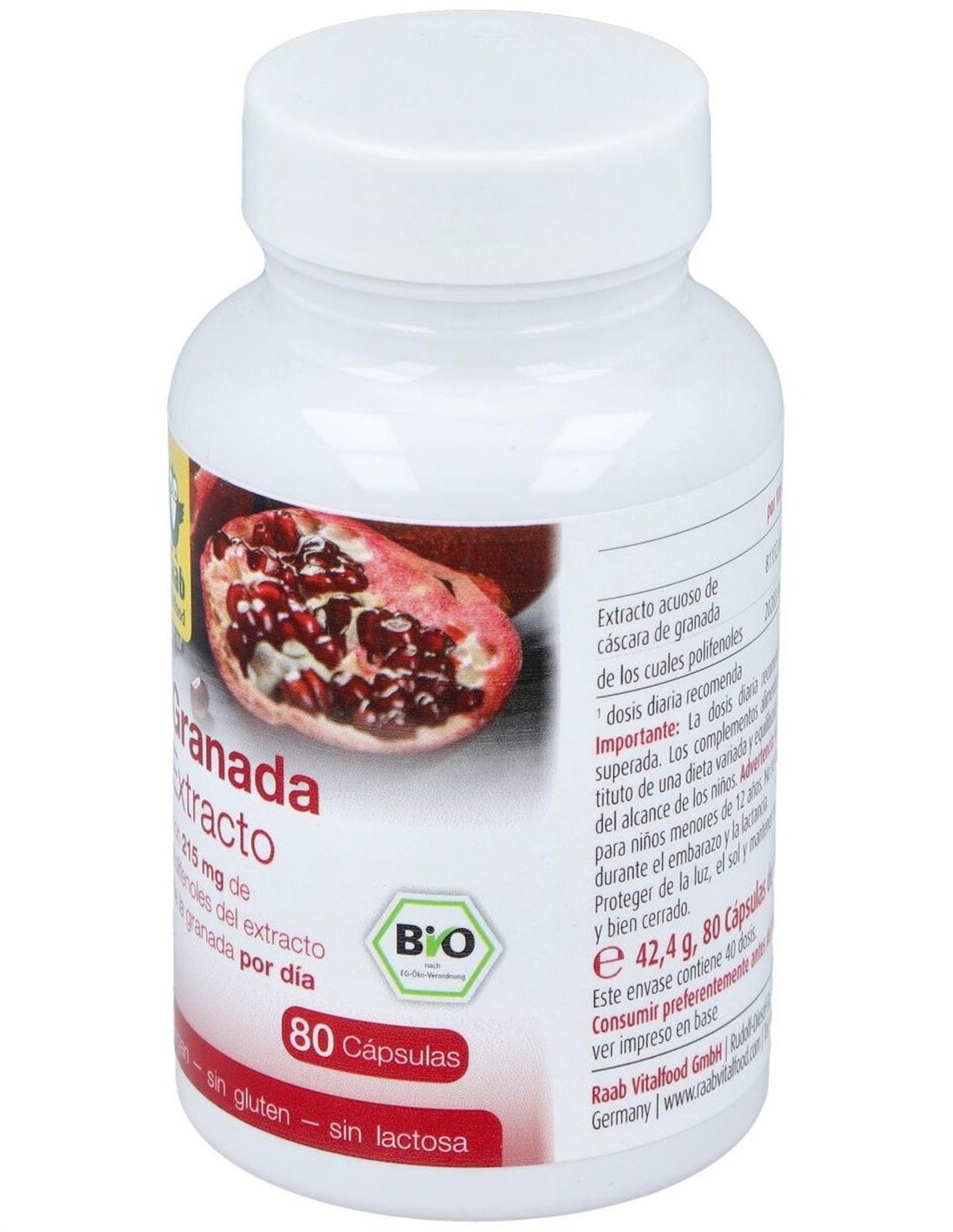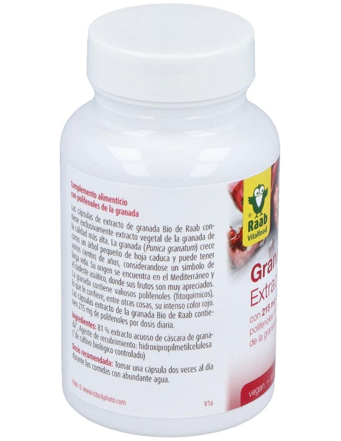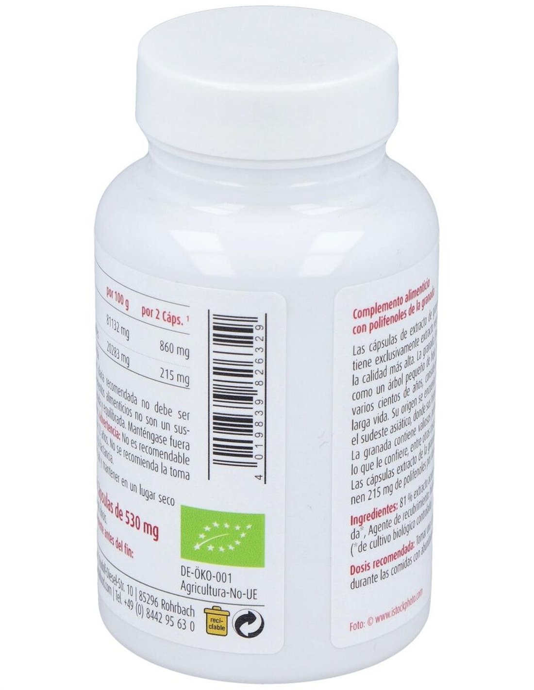 Complemento alimenticio a base de extracto de granada orgánica. Apto para veganos.